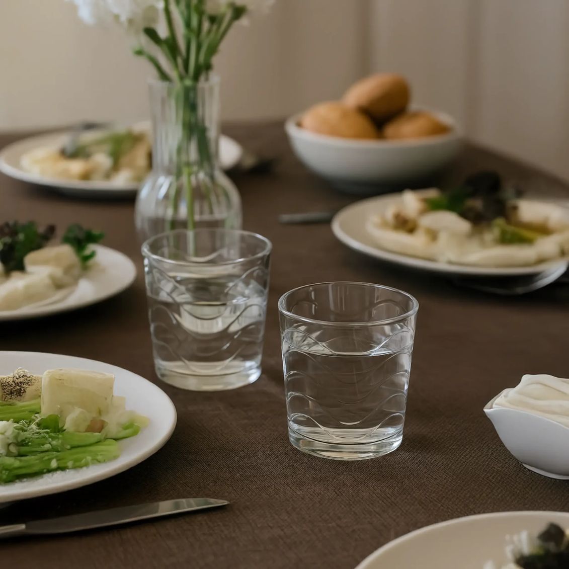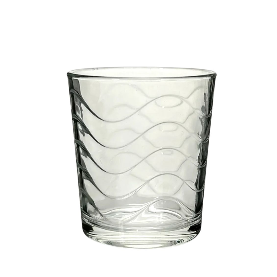 Il loro aspetto neutro e sofisticato li rende perfetti per abbinarsi a qualsiasi tipo di stoviglie e arredamento, dal classico al moderno. La trasparenza impeccabile esalta il colore delle bevande, mentre la texture a onde non solo arricchisce l’estetica, ma migliora anche la presa, rendendoli confortevoli da tenere in mano.