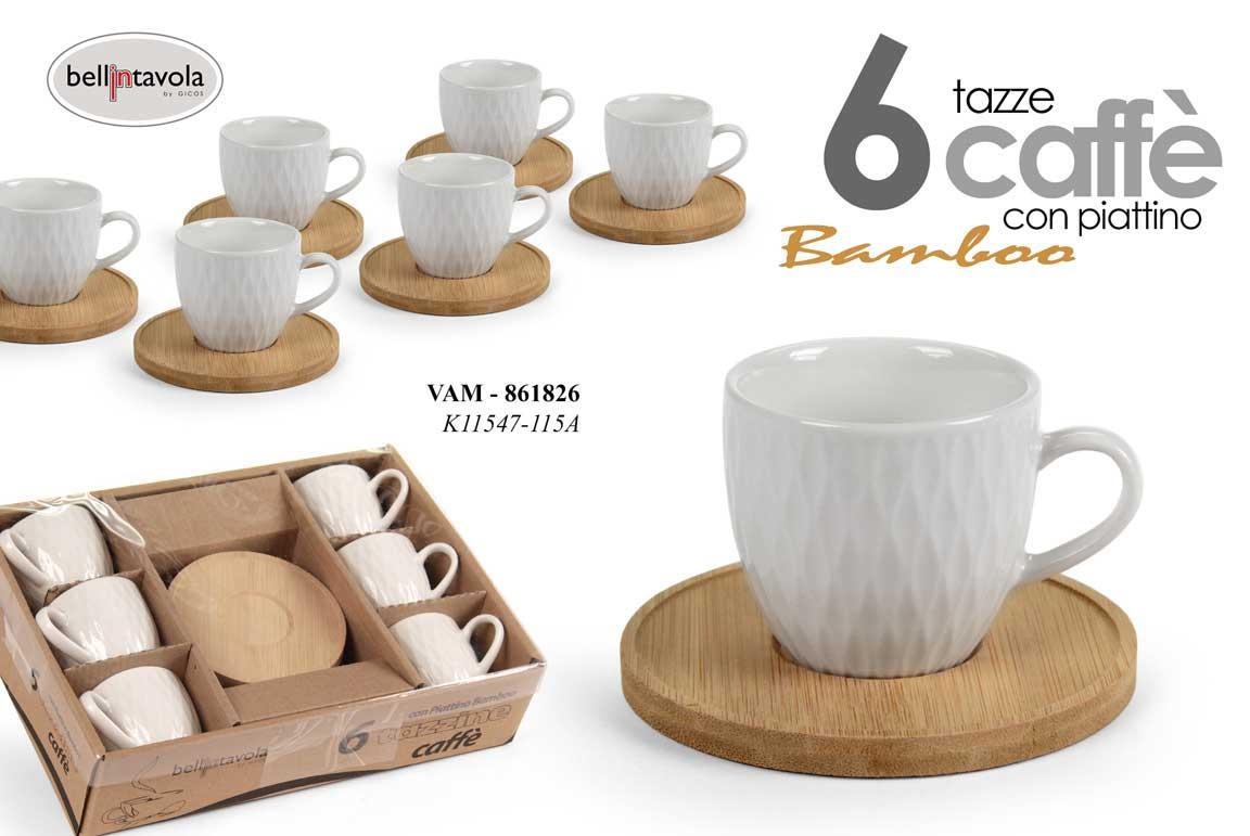 .Questo elegante set include sei tazzine da caffè in ceramica bianca del marchio Bellintavola by Gicos, ognuna accompagnata dal suo piattino in bamboo naturale. Questo abbinamento unisce la semplicità e la purezza della ceramica con il calore e l'eco-sostenibilità del bamboo, creando un set dal design moderno e accattivante.