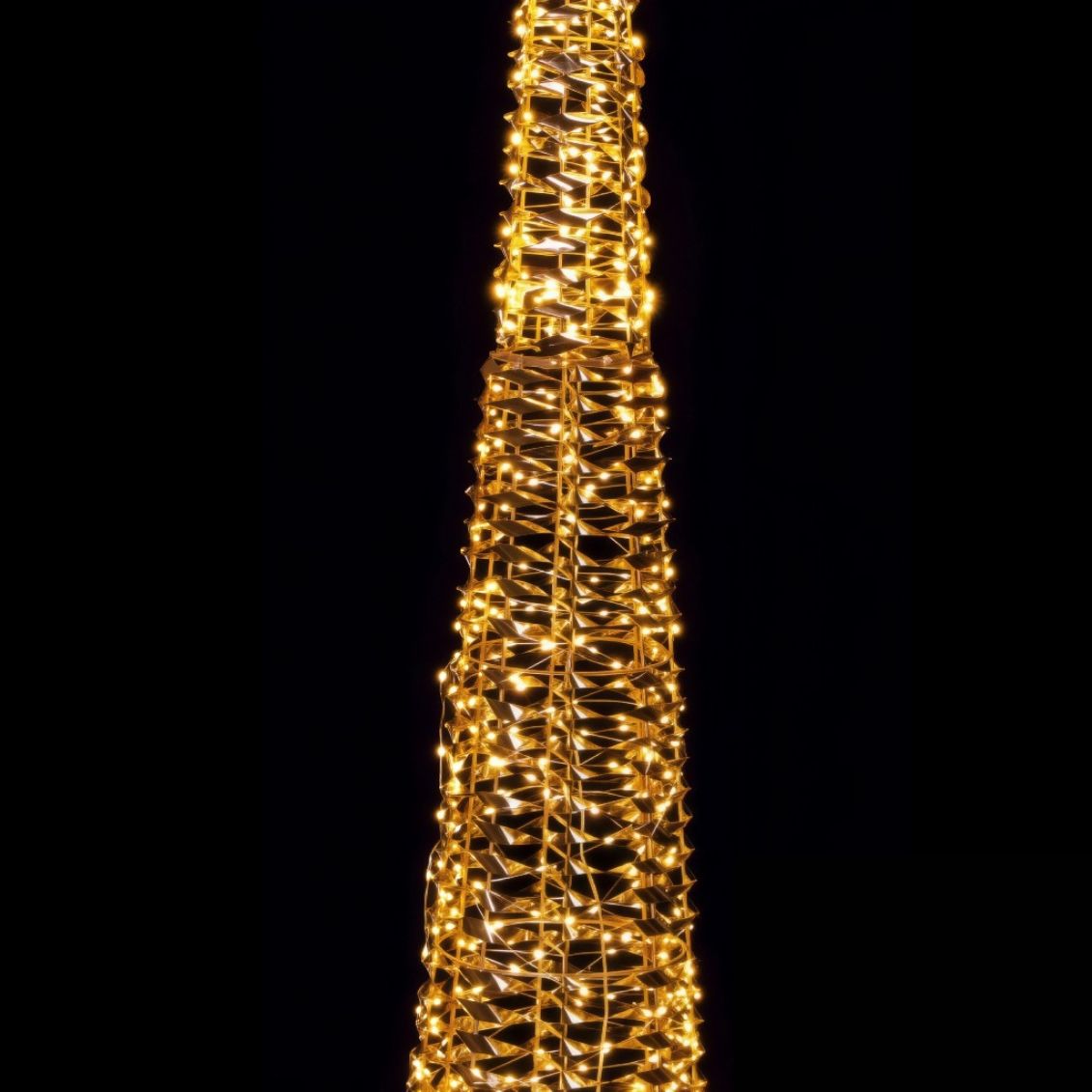.Albero di Natale maestoso e luminosissimo con struttura in ferro e PE oro brillante. Questo albero decorativo di 180 cm di altezza e 30 cm di diametro è dotato di 1.200 LED bianchi a luce calda che creano un'atmosfera magica e straordinariamente luminosa. Perfetto sia per ambienti interni che esterni, combina eleganza sofisticata e impatto visivo spettacolare. I LED a basso consumo energetico garantiscono lunga durata e economicità pur mantenendo una luminosità eccezionale. Ideale per trasformare qualsiasi spazio in una scenografia natalizia da favola, dove la luce calda riflessa dall'oro crea un effetto di pura magia.