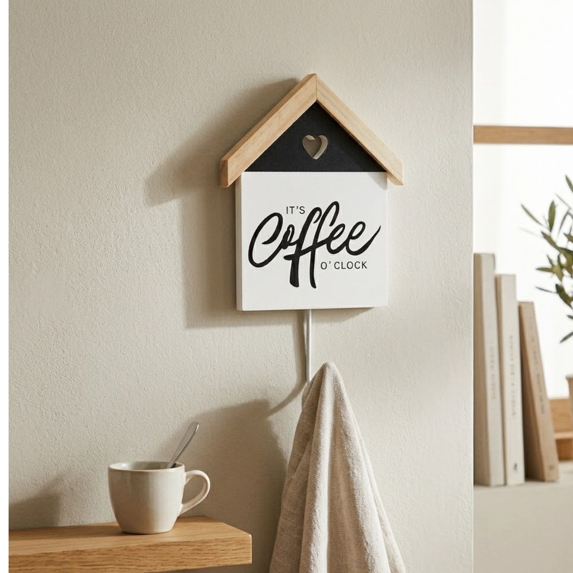 Questo appendino unisce utilità e decorazione con un design a tema caffè immediatamente riconoscibile. La forma a casetta con tetto in legno naturale e cuore ritagliato aggiunge calore e personalità a qualsiasi parete, mentre il gancio in metallo nella parte inferiore è pratico per appendere tazze da caffè, grembiuli da cucina, chiavi o piccoli accessori. Le dimensioni contenute — 13x23 cm — lo rendono adatto anche agli spazi più stretti. È un regalo apprezzato per gli amanti del caffè e per chi ama decorare la cucina con oggetti dal gusto country e shabby chic.