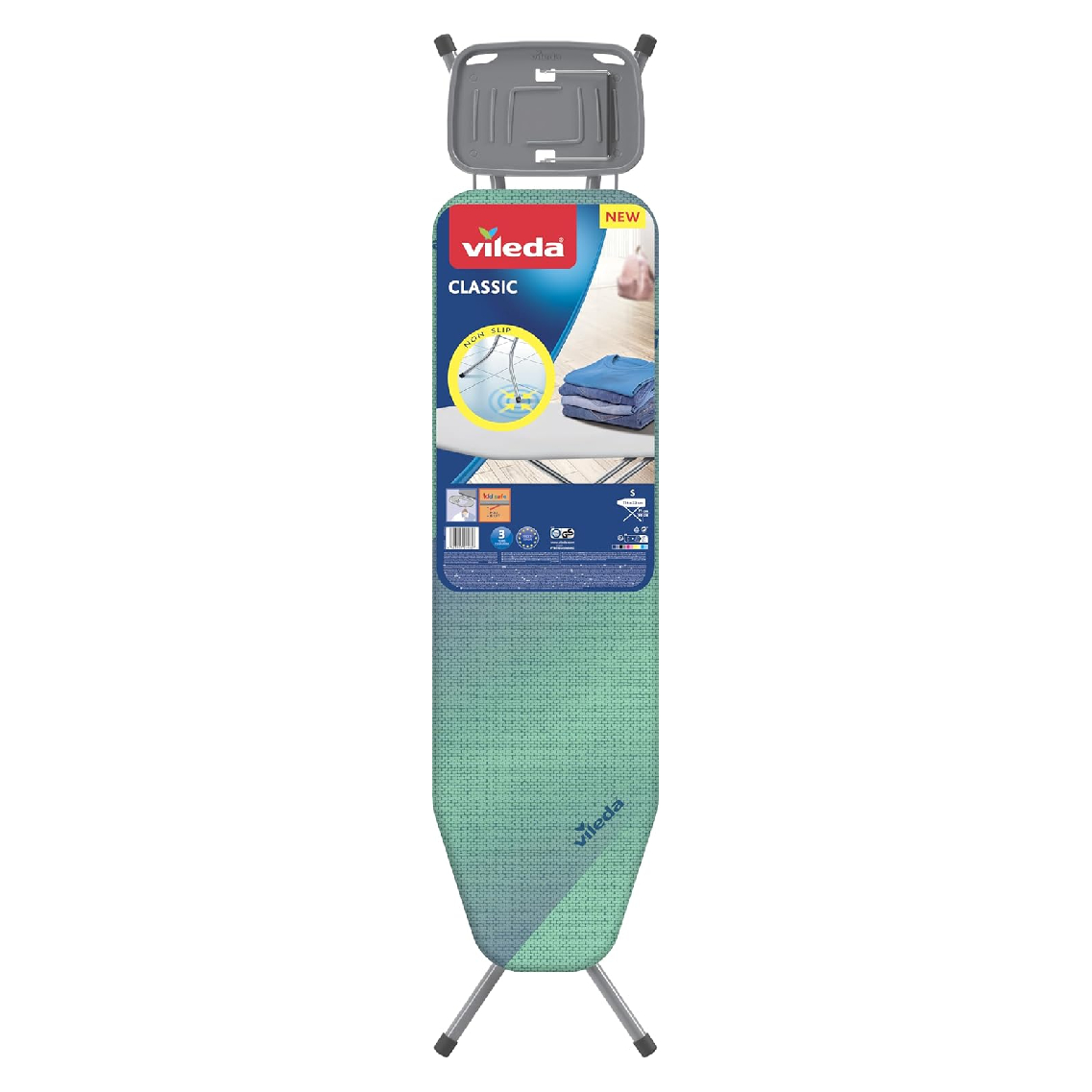 Vileda Classic taglia S è un’asse da stiro compatta con piano 114 x 33 cm e altezza regolabile 71–90 cm, dotata di copriasse 100% cotone con imbottitura per una buona traspirazione del vapore. Codice EAN: 4023103244627.