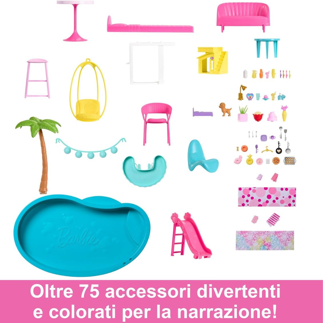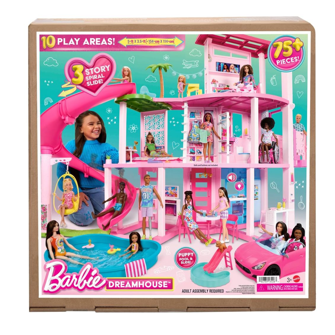 Assembla la Casa dei Sogni con l'aiuto di un adulto e preparati a vivere infinite avventure con Barbie! Organizza una festa in piscina facendo scivolare le bambole lungo lo scivolo a spirale di 3 piani fino alla piscina. Quando cala la sera, trasforma il soggiorno in una camera da letto estraendo il letto nascosto e creando un pigiama party per 4 bambole sotto le stelle. Utilizza l'ascensore per spostarti tra i piani, cucina nella cucina interattiva con luci e suoni, fai giocare il cucciolo nella sua area dedicata con mini piscina e scivolo. Arreda ogni stanza con gli oltre 75 accessori inclusi: dalla cabina armadio alla sala da pranzo, dal bagno alla camera per gli ospiti. Con 10 aree gioco diverse, le possibilità sono davvero infinite!