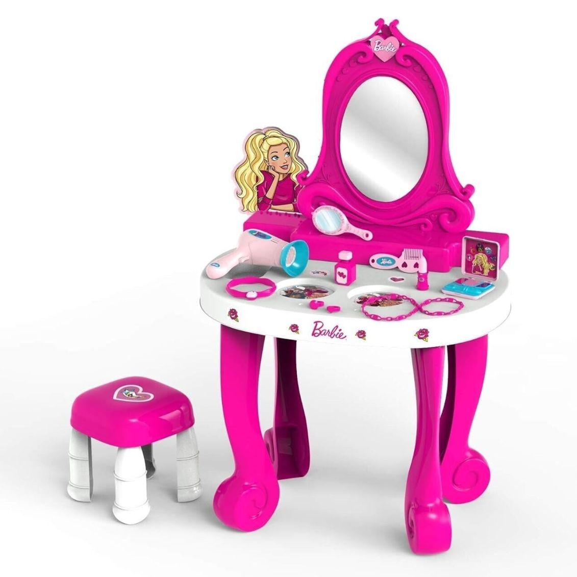 .La specchiera dei sogni per sentirsi una vera Barbie! Big Vanity Set da 78cm di altezza con sgabello elegante incluso e 10 accessori completi per bellezza e stile. Include pettine, asciugacapelli, spazzola, cerchietti e tanti altri accessori per creare look fantastici. Dimensioni perfette 40x78x19cm per una visione completa del proprio stile, trasformando i sogni di moda in realtà per ogni giovane fashionista.