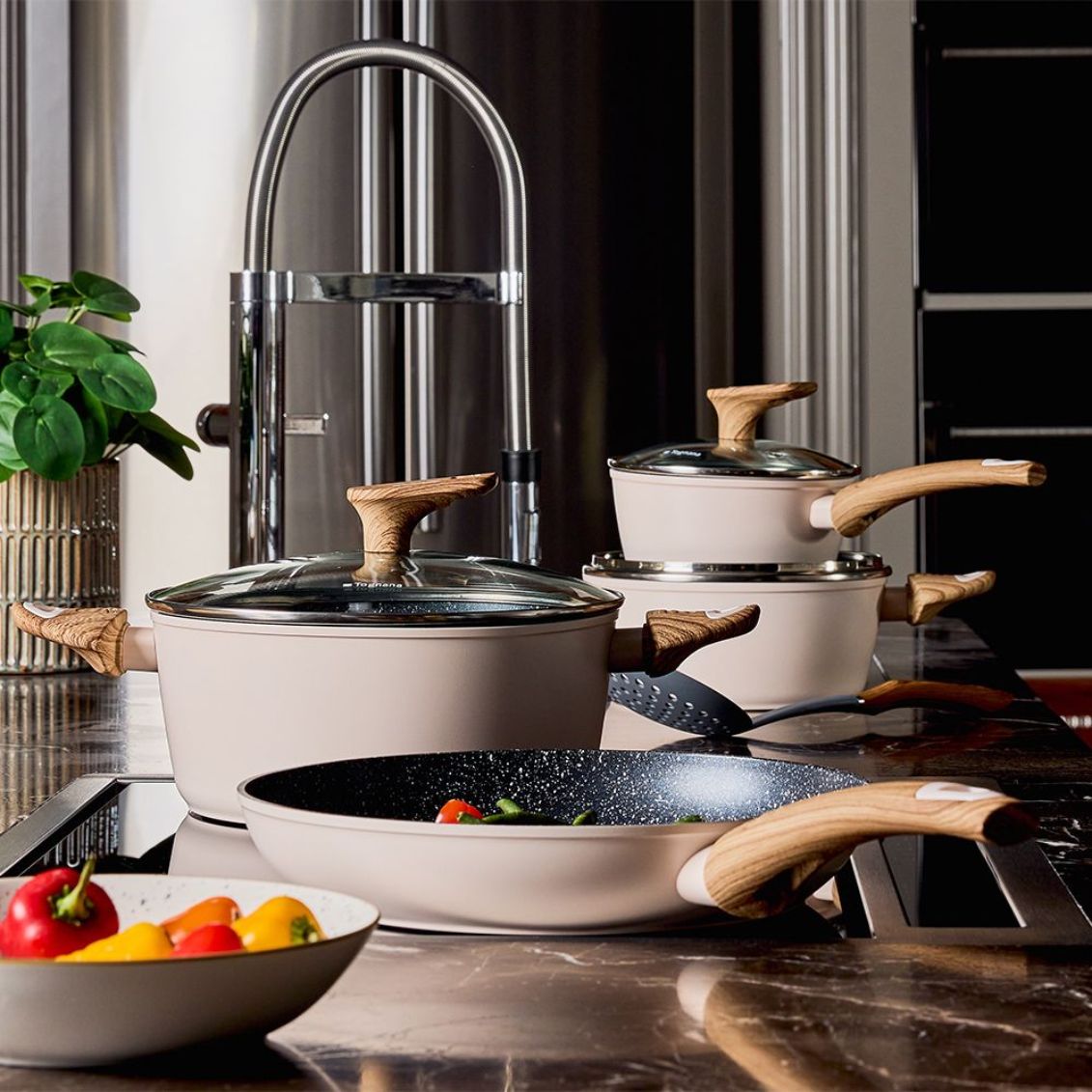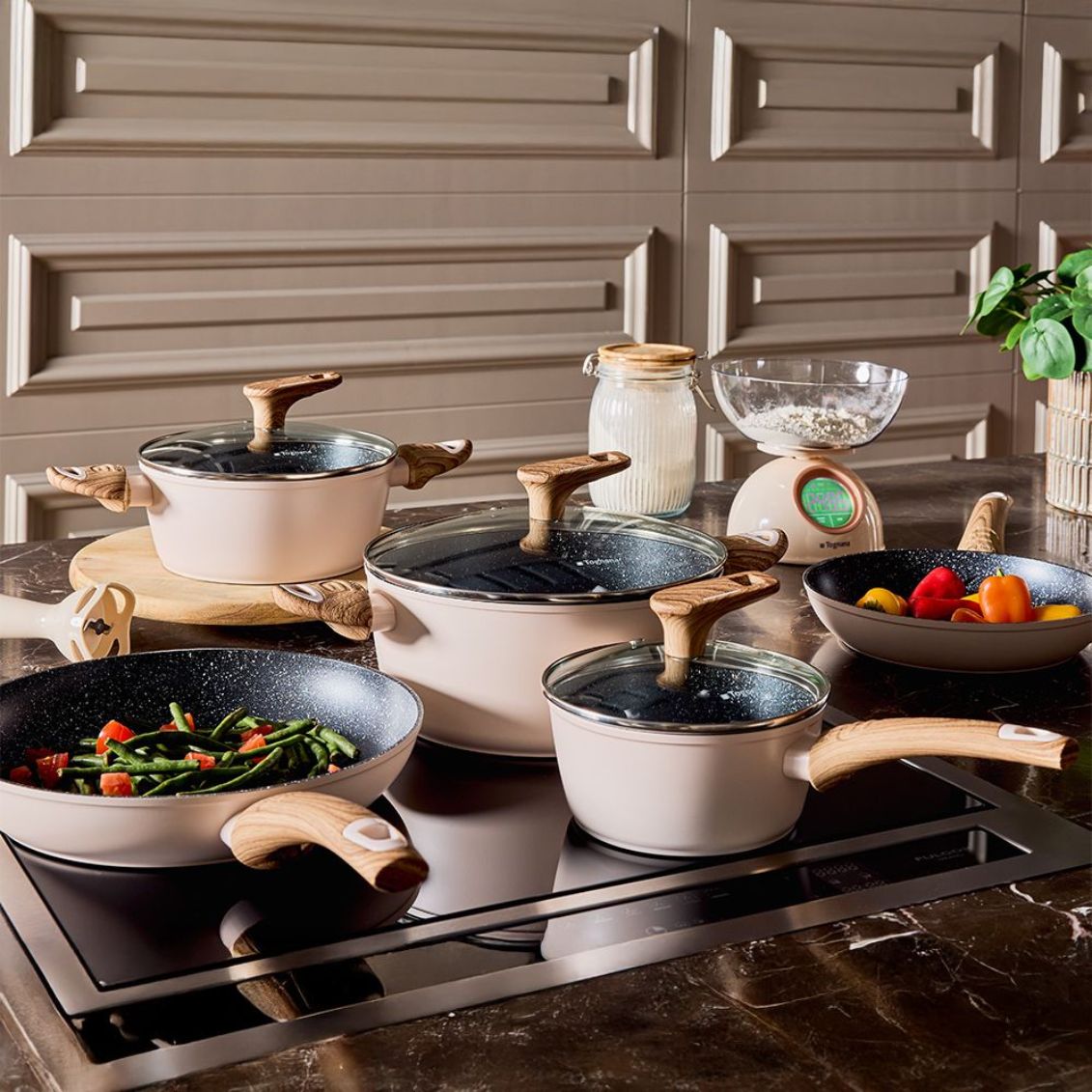 Il set Forged Vanilla non è solo un utensile da cucina, ma un vero e proprio complemento d'arredo. La tonalità neutra e raffinata si abbina perfettamente alla linea di piccoli elettrodomestici Iridea Champagne, permettendo di creare un ambiente coordinato e chic. La composizione da 8 pezzi offre tutto il necessario per la cucina di ogni giorno: due padelle per cotture veloci, tre casseruole di diverse dimensioni per bolliti, risotti e sughi, completate dai relativi coperchi trasparenti. La superficie antiaderente permette di cucinare pietanze delicate come uova o pesce senza che si attacchino, facilitando notevolmente anche le operazioni di pulizia.