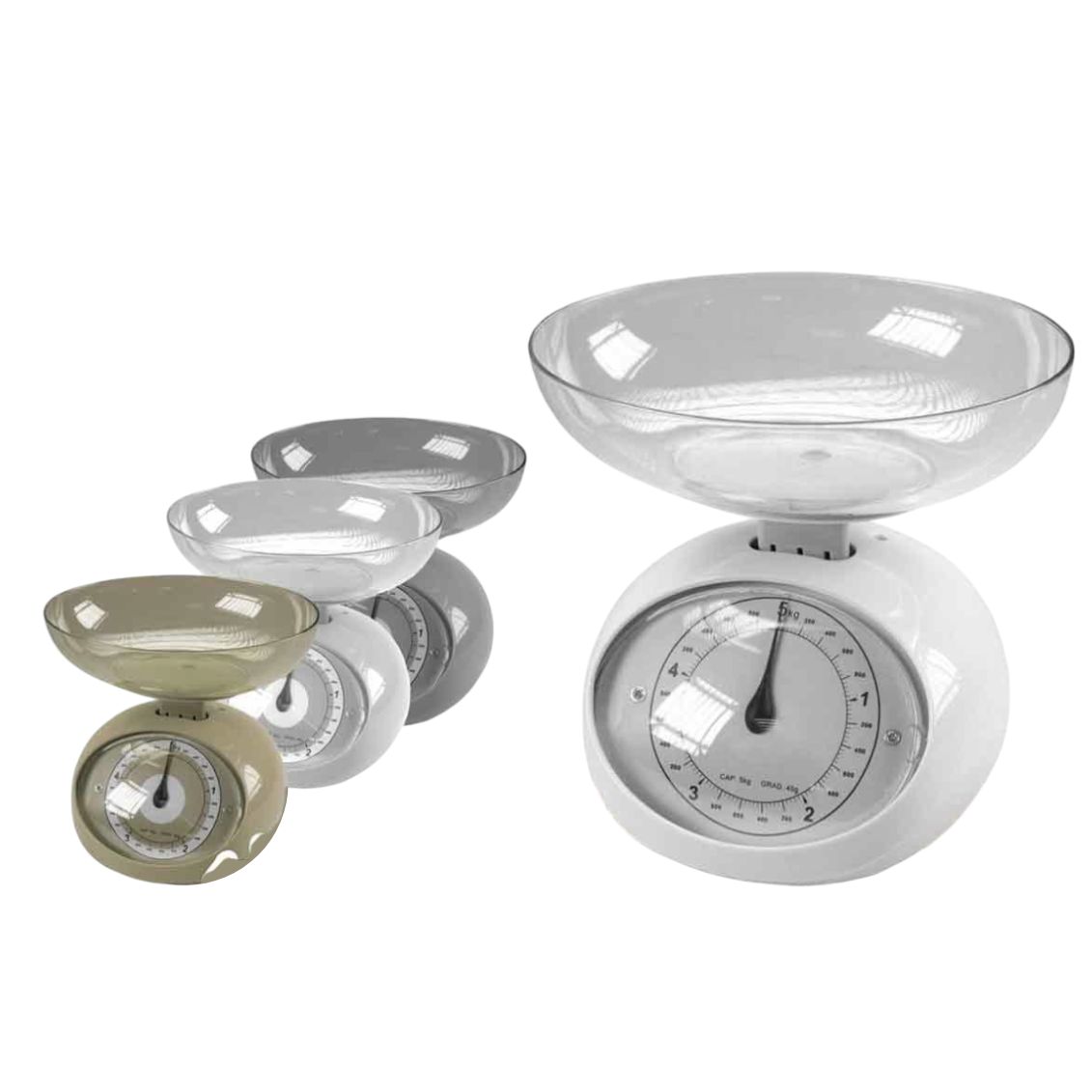 .Pratica bilancia da cucina meccanica con capacità massima di 5 kg e design vintage, corredata da ciotola trasparente colorata in tre finiture assortite per abbinarsi a qualsiasi ambiente.