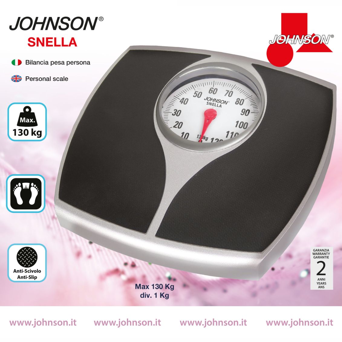 .Classica affidabile senza batterie! Snella di Johnson è la bilancia pesapersone meccanica analogica 130 kg con lancetta tradizionale. Design classico robusto qualità eccellente. Grande quadrante Ø30,5cm scala visuale totale facilmente leggibile. Lancetta rossa precisa mostra peso intervalli chiari 1 kg. Rotella regolazione azzeramento precisa taratura risultati affidabili. Pedana rivestimento antiscivolo gomma nera stabilità sicurezza massima. Funzionamento puramente meccanico zero batterie zero elettronica. Portata 130 kg divisione 1 kg. Dimensioni 30,5x30x5 cm compatta. Certificato PT720. Ideale controllo giornaliero peso affidabilità duratura!