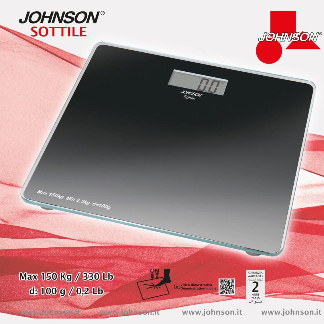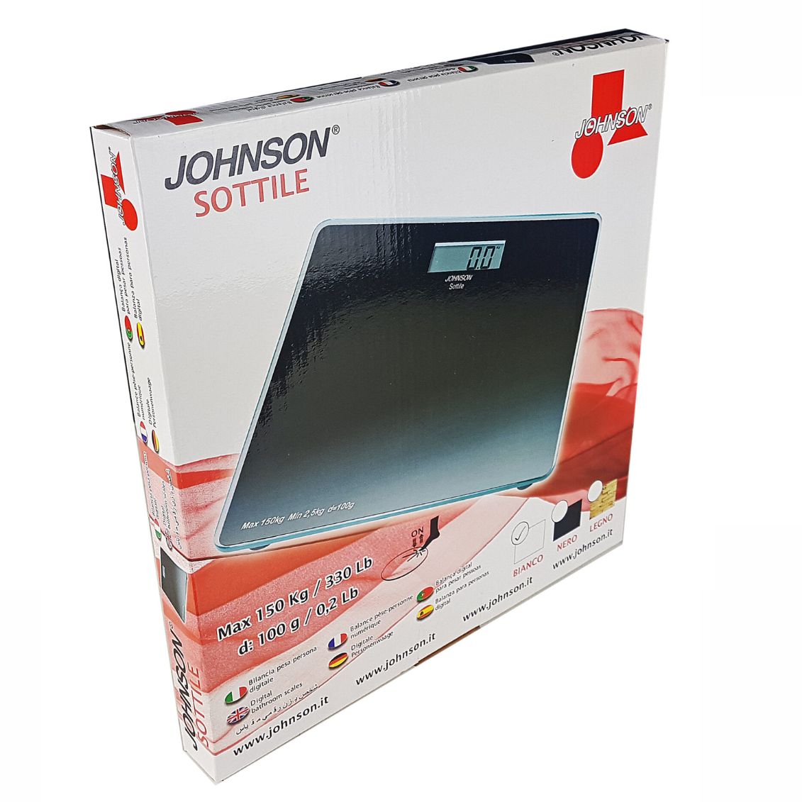 .Design ultra sottile eleganza minimalista! Sottile di Johnson è la bilancia pesapersone digitale 150 kg design ultra slim 2 cm spessore. Piattaforma vetro temperato 30x30 cm rettangolare elegante nera. Display LCD chiaro lettura immediata. Accensione tocco piede leggero attiva istantaneamente. Autocalibrazione automatica basta salire. Sensori alta precisione 100g divisione misurazioni affidabili. 2 unità misura Kg/Lb cambio facile. 4 cuscinetti antiscivolo stabilità massima. Azzeramento spegnimento automatico. Indicatori sovraccarico batteria scarica. Batteria CR2032 inclusa. Certificato PT-915. Design minimale moderno bagni contemporanei!