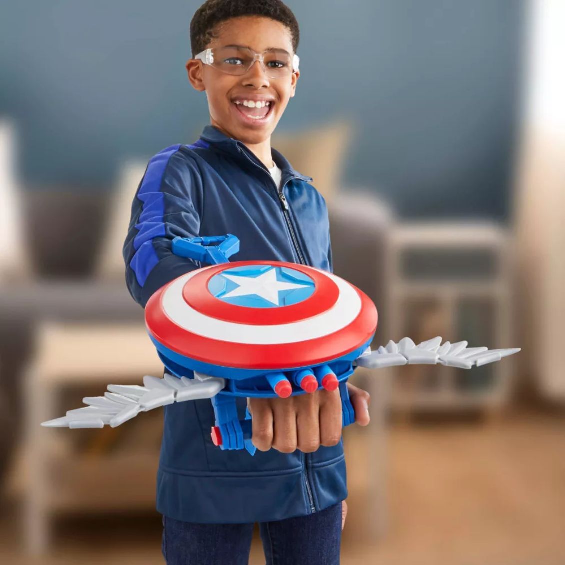 .I poteri di NERF e Marvel combinati nello scudo di Captain America! Skyshot Blaster ispirato all'ultimo film Marvel Studios Captain America Brave New World, permette ai bambini dai 5 anni di immedesimarsi in Sam Wilson. Include 3 dardi NERF, ali che si aprono automaticamente e sistema di lancio facile: carica, tira la leva e premi il pulsante. Utilizzabile con mano destra o sinistra grazie ai pulsanti su entrambi i lati, con cinturino regolabile per comfort. Perfetto come accessorio per costumi Captain America e regalo epico per fans Marvel!