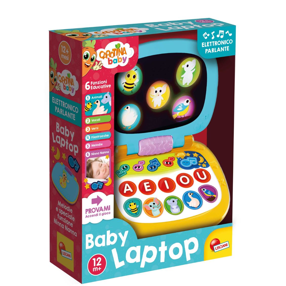 Laptop elettronico parlante per bambini dai 12 mesi! Scopri simpatici animali con questo divertente laptop educativo. Con display specchio luminoso, 6 funzioni educative interattive e tanti effetti sonori e luminosi. Impara animali, vocali, versi, filastrocche, melodie e ascolta la ninna nanna. Design colorato e sicuro firmato Carotina Baby.