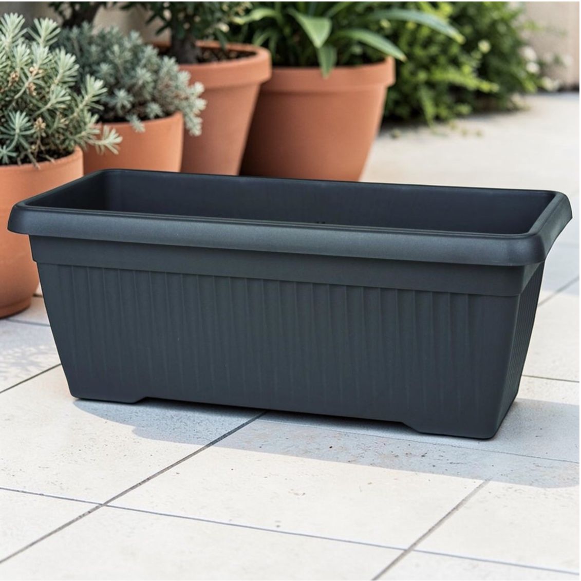 La Mediteran Maxi in antracite è pensata per chi desidera allestire balconi e terrazze con fioriere di grande impatto visivo in chiave moderna e minimalista. Le dimensioni generose permettono di coltivare piante di media taglia, aromatiche o composizioni floreali, mentre il formato rettangolare si adatta perfettamente ai parapetti e alle ringhiere. Il colore antracite si integra con eleganza in contesti contemporanei e abbinamenti cromatici neutri.