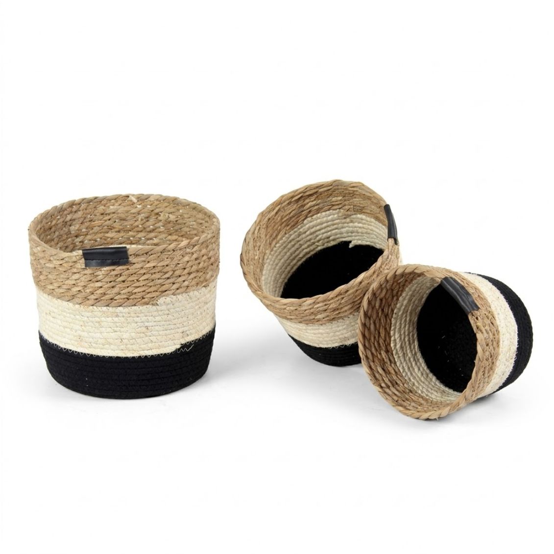Questa cesta unisce funzionalità e design in un unico oggetto: la lavorazione a corda intrecciata garantisce struttura e resistenza, mentre il pattern tricolore a fasce orizzontali — naturale, bianco e nero — crea un effetto grafico pulito e contemporaneo. Le dimensioni di Ø 30x15 cm la rendono capiente senza ingombrare, adatta sia come porta-vaso per piante di medie dimensioni che come contenitore per soggiorno, camera da letto o bagno. Il materiale naturale si abbina perfettamente a superfici in legno, rattan e tessuti neutri, tipici degli interni in stile boho e nordico.