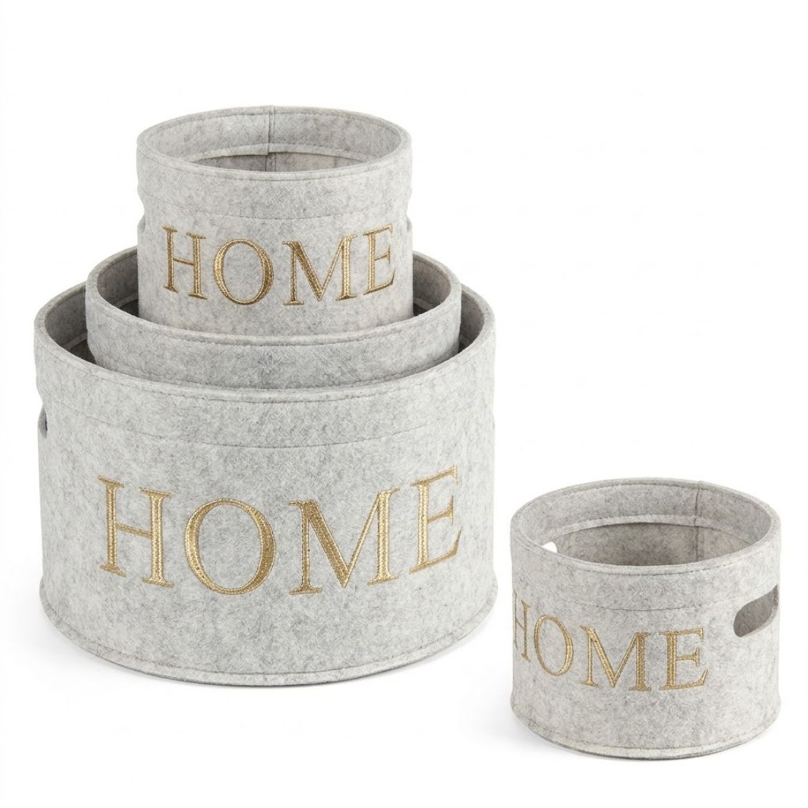 La Cesta Tonda in Feltro "Home" Ø 25x16 cm – L'Arte dell'Intreccio by Gicos (art. 2314BC) è un contenitore cilindrico in feltro con scritta "HOME" ricamata in filo dorato, manici laterali ritagliati e 2 colori assortiti (grigio scuro e grigio chiaro/beige). Codice EAN: 8025569889783.