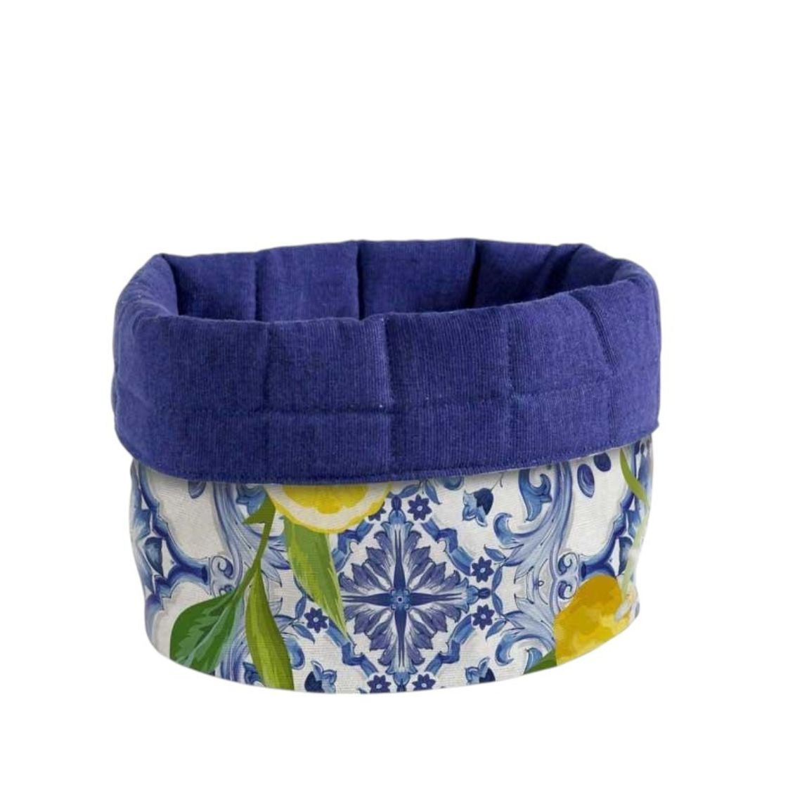 .Un tocco di stile mediterraneo per la tua tavola! Questo cestino in tessuto, con fantasia ispirata alle maioliche siciliane e bordo imbottito blu, è ideale per servire pane, frutta o dolcetti.