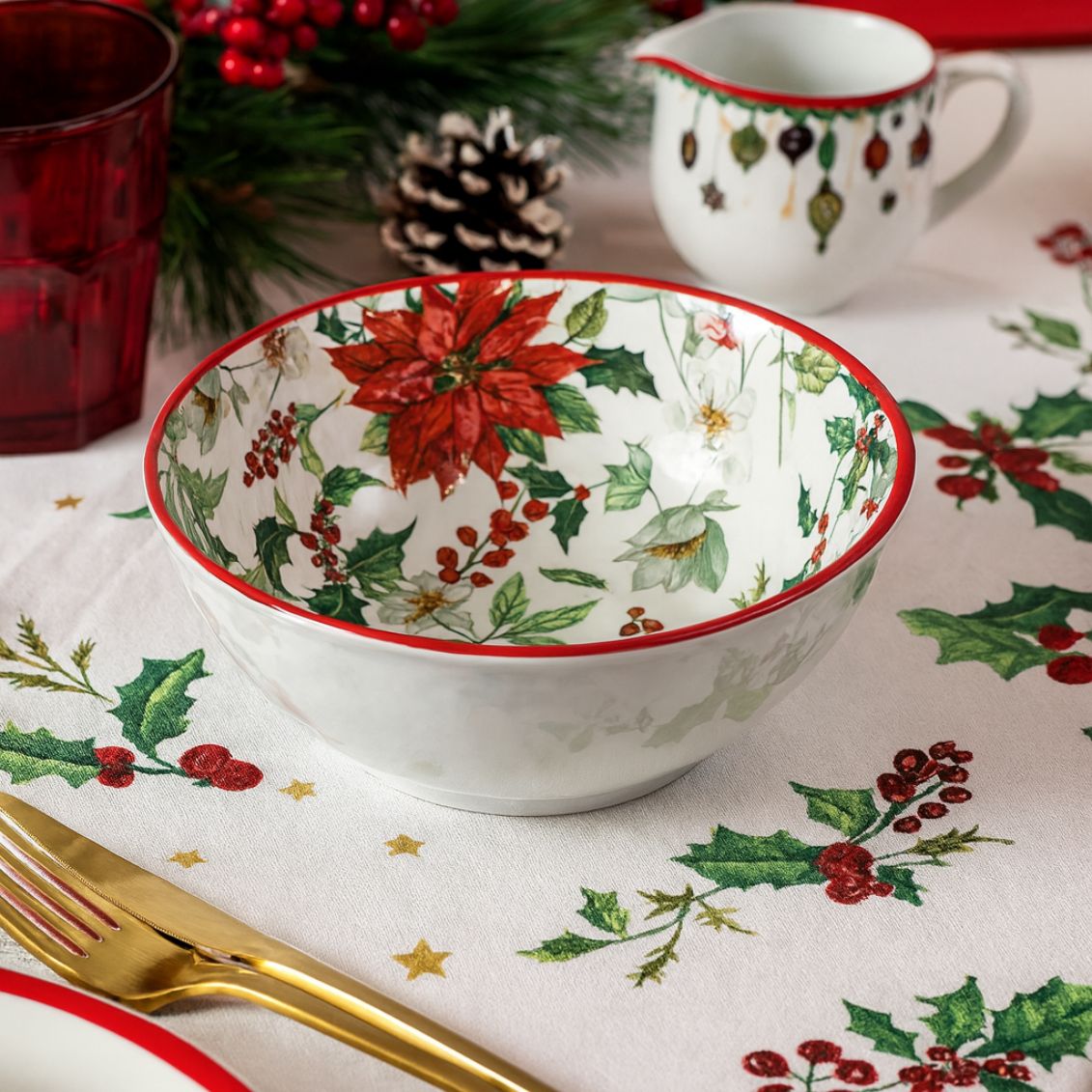 .Ciotola natalizia decorata in melamina resistente e leggera Ø12cm! Questa pratica ciotola Christmas Vischio presenta decorazioni festive con stelle di Natale rosse, fiori bianchi, agrifoglio verde e bacche rosse su fondo bianco con bordo rosso vivace. Realizzata in melamina antiurto, atossica e BPA-free, è perfetta per uso quotidiano e occasioni speciali. Lavabile in lavastoviglie fino a 70°C, leggera e maneggevole. Ideale per insalate, snack, frutta, gelati e dolci. Dimensioni compatte Ø12cm h5.5cm per porzioni individuali eleganti durante le festività!