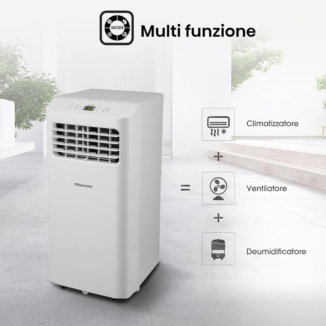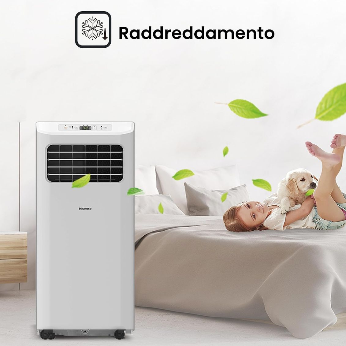 .Climatizzatore portatile da 9000 Btu/h con classe energetica A, ideale per raffrescare ambienti fino a 14-20 mq. Offre funzioni 3-in-1 (raffreddamento, deumidificazione, ventilazione), display LED, timer 24 ore e modalità notturna Sleep per il massimo comfort. Utilizza gas ecologico R290 a basso impatto ambientale.