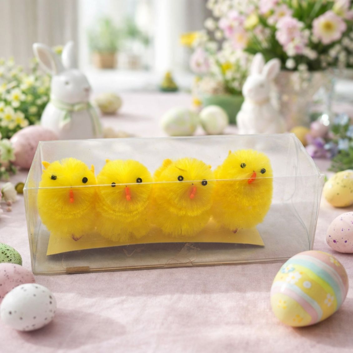 Questi pulcini decorativi sono un classico intramontabile per le decorazioni di Pasqua e di primavera. Grazie alla loro dimensione compatta di 5 cm e alla confezione da 4 pezzi, sono pronti all'uso per arricchire centrotavola, cestini pasquali, composizioni floreali e confezioni regalo. La scatolina trasparente li rende pratici da conservare e da riutilizzare ogni anno. Sono apprezzati da hobbisti, insegnanti per lavoretti creativi con i bambini e fioristi alla ricerca di piccole decorazioni di stagione.