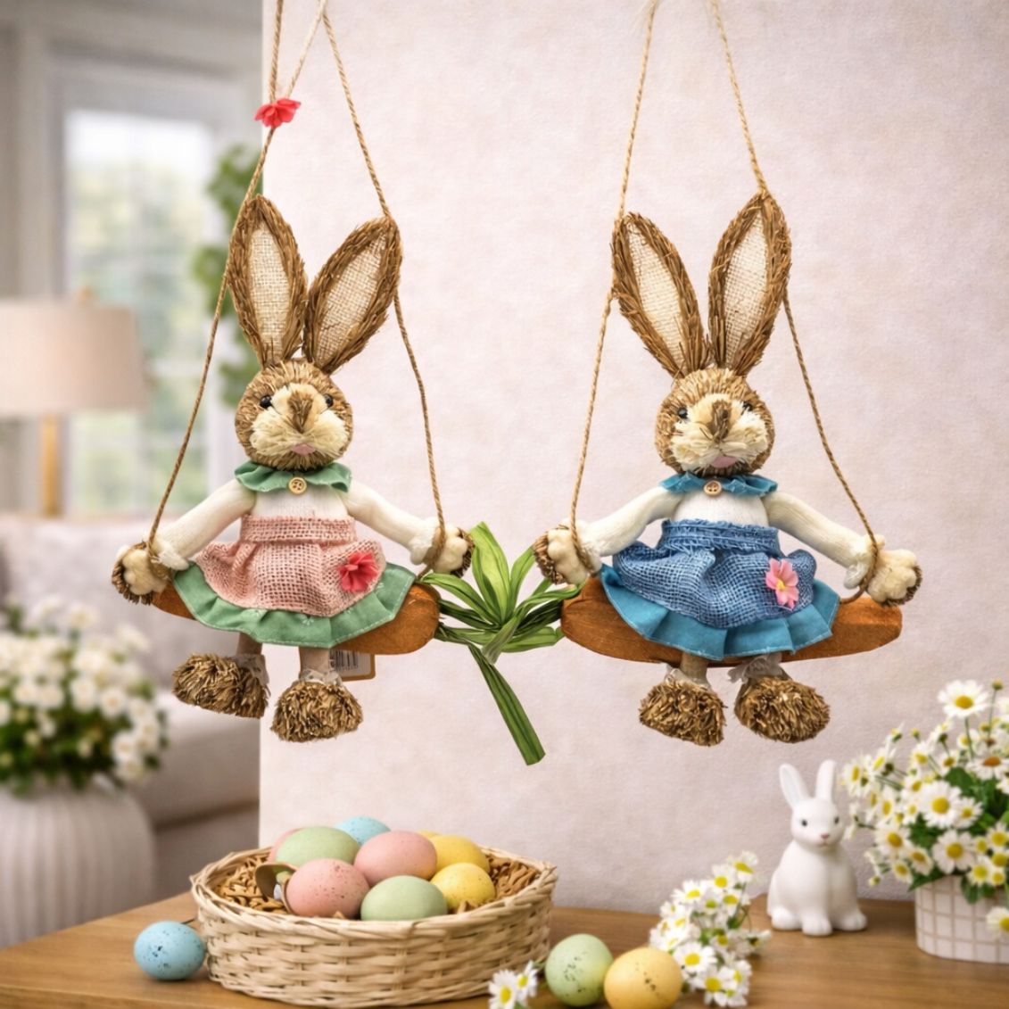 .Sorprendi grandi e piccini con questa meravigliosa e originale decorazione pasquale da appendere. Protagonista è una simpatica coniglietta dal musetto dolce, realizzata in fibra naturale intrecciata effetto paglia e vestita con una curata magliettina e una colorata gonnellina in tessuto. Il tocco di genialità risiede nella seduta: la coniglia riposa comodamente su un'altalena a forma di grande carota rustica, sospesa tramite robuste corde in spago grezzo. Con un'altezza totale di ben 78 cm (corde incluse), è un addobbo scenografico perfetto per vetrine, ampi soggiorni o per impreziosire finestre e porticati, donando un irresistibile tocco country-chic alla tua Pasqua.