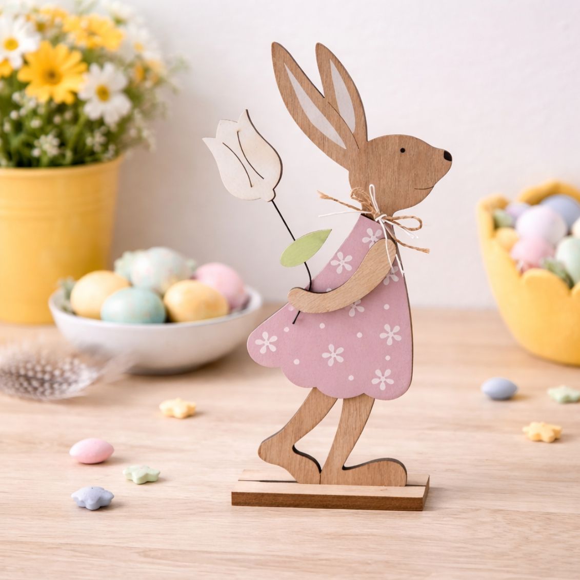 Questa statuetta incarna perfettamente l'estetica della Pasqua nordica. Il calore del legno naturale, lasciato a vista sul muso e sulle braccia, si sposa in modo armonioso con le delicate verniciature rosa pastello dei vestiti. Grazie all'altezza importante (29 cm), il coniglietto non passa inosservato, catturando l'attenzione senza risultare invadente. È il regalo ideale per gli amanti dell'oggettistica per la casa, o un acquisto perfetto per allestire vetrine di negozi di abbigliamento, pasticcerie e fiorerie durante il periodo primaverile.