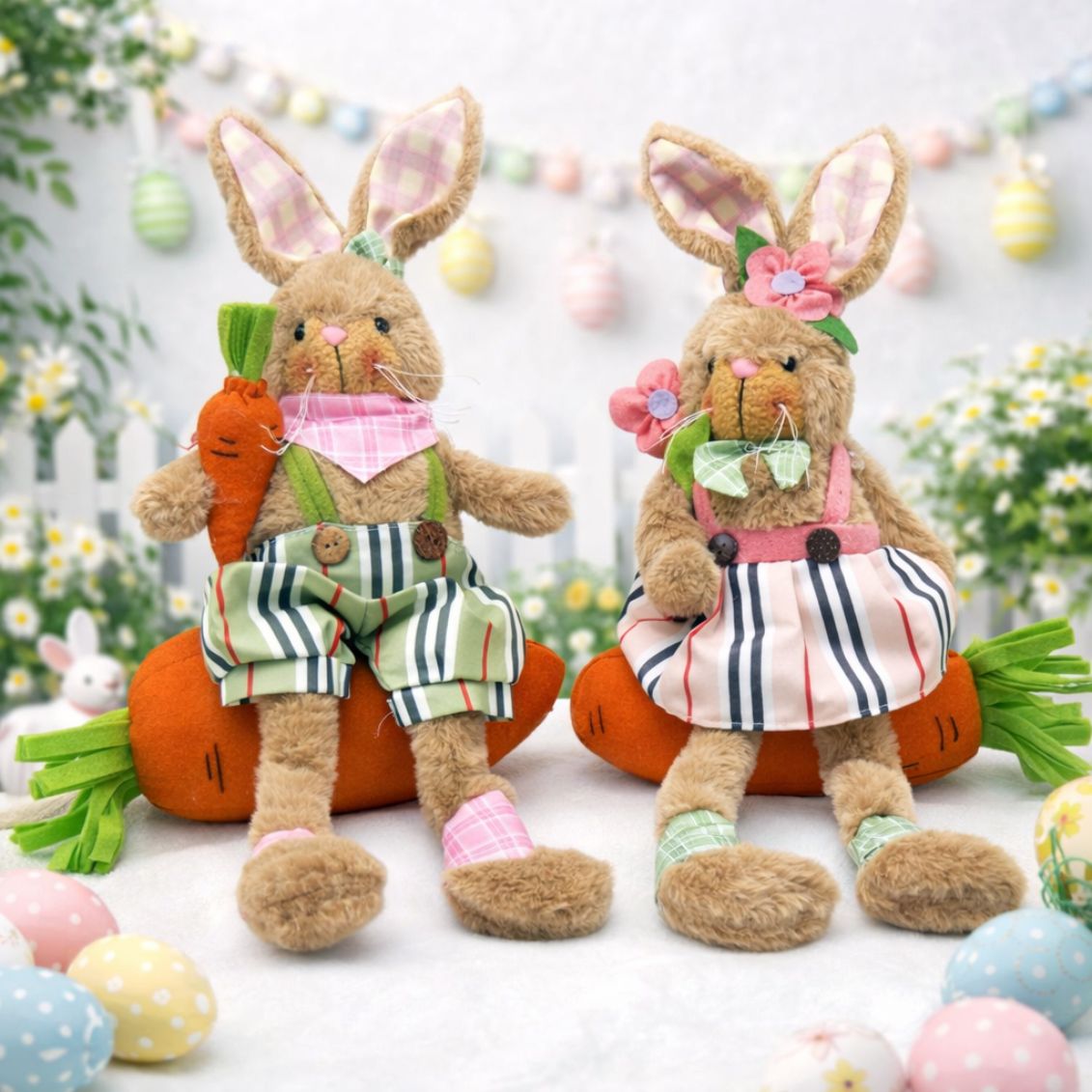 Coniglio decorativo in peluche beige con gambe penzolanti, in posizione seduta su una grande carota decorativa in feltro arancione. Il modello maschio indossa pantaloncini a righe verde/grigio con bretelle e foulard rosa a quadretti, e tiene una carota in mano; la femmina ha gonnellina a righe rosa/grigio con bretelle, fiocco verde e fiori decorativi sul capo. Le orecchie sono foderate in tessuto a quadretti rosa. Altezza complessiva circa 46 cm. Ideale come decorazione pasquale per mensole, tavoli e composizioni primaverili. Disponibile su Ipershop con spedizione veloce in tutta Italia.