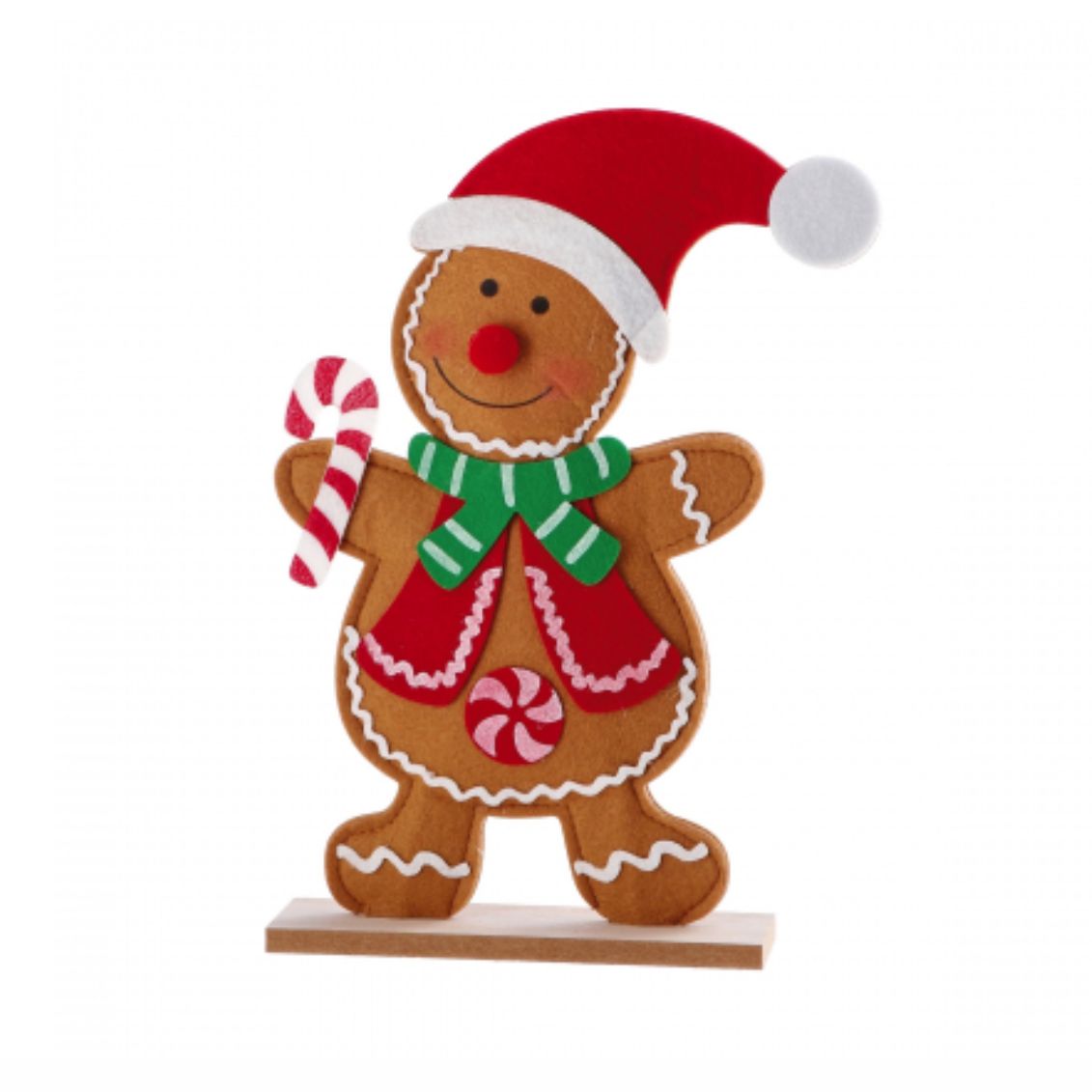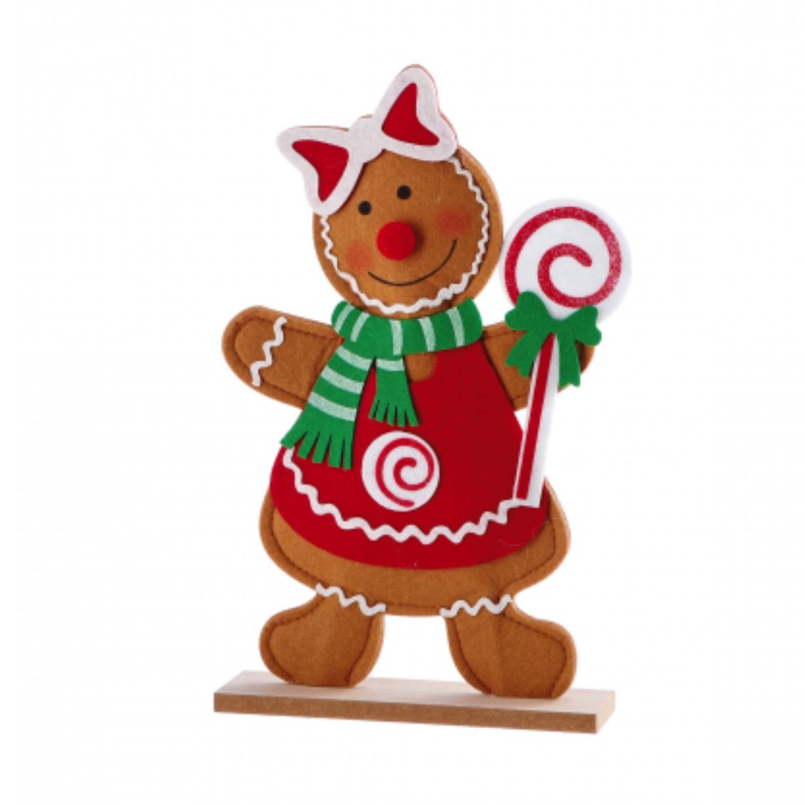 Il dolce simbolo del Natale che scalda il cuore! Questa adorabile decorazione natalizia di 31 cm raffigura i classici omini pan di zenzero (gingerbread) in TNT con base in MDF resistente. Disponibile in 2 modelli: omino con bastoncino di zucchero e omina con lecca-lecca. I colori caldi marrone, rosso e verde con dettagli bianchi ricreano l'atmosfera dei biscotti natalizi. Perfetti per mensole, tavoli e composizioni festive.