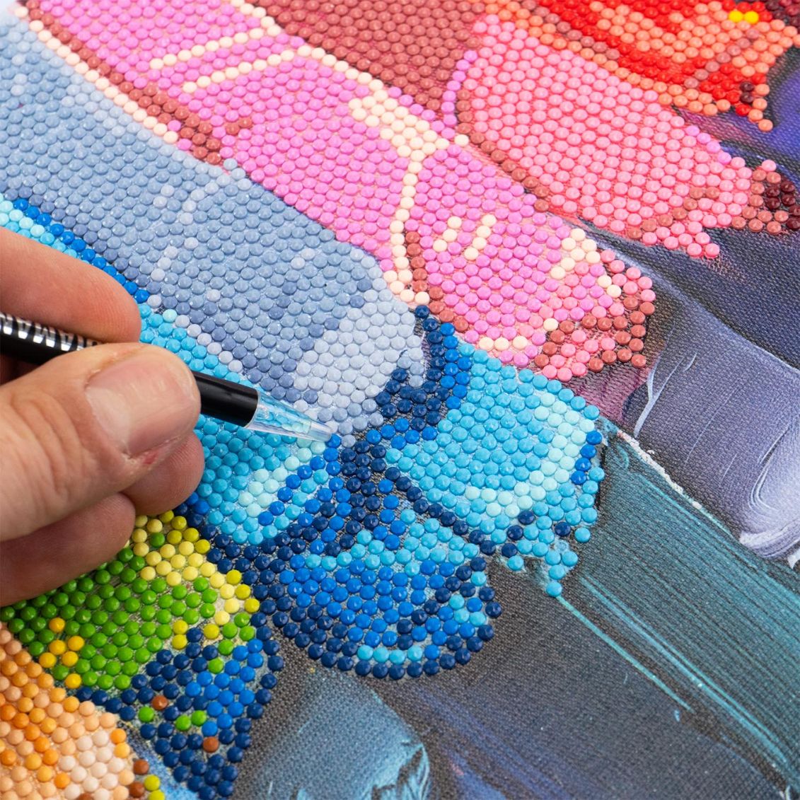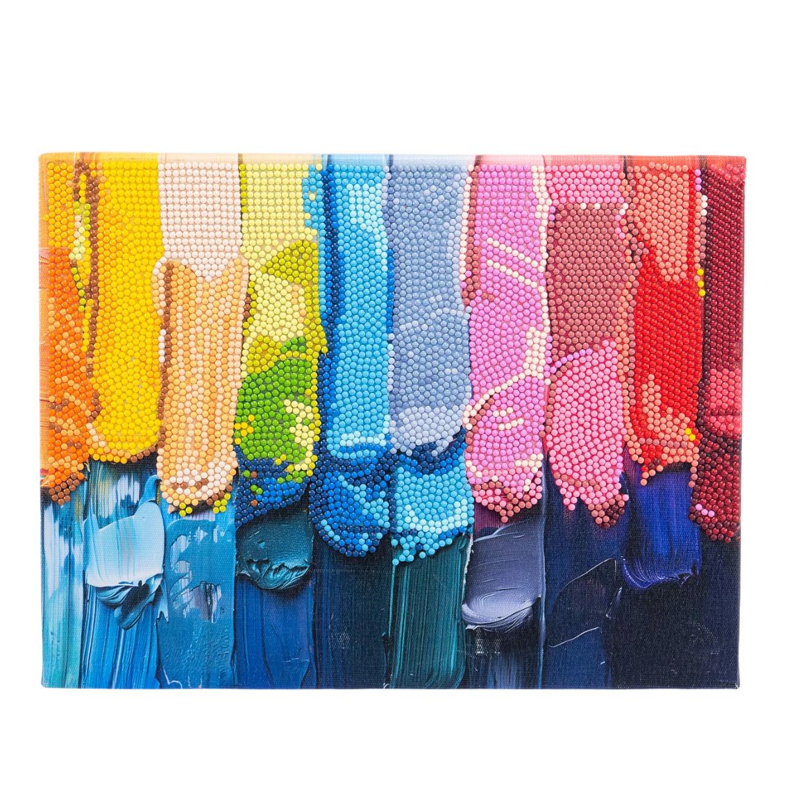 .Diamantiny Level Up: oggi è Quadro! Immagini decorative e iconiche direttamente su telaio rigido pronto per essere appeso una volta completato. Un'opera d'arte astratta moderna con pennellate di colore vivaci che prende vita grazie a oltre 3000 cristalli scintillanti. Giallo, beige, turchese, azzurro, rosa e rosso si mescolano come in una vera tavolozza da pittore. La tela è sostenuta da una tavoletta rigida per permettere un'aderenza perfetta delle gemme e un risultato professionale.