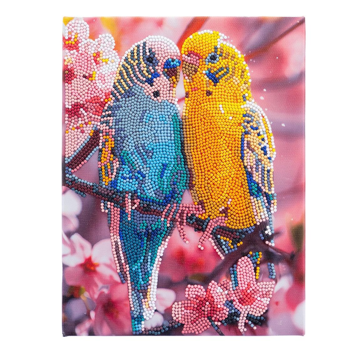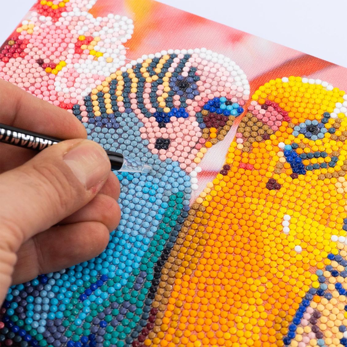 .Diamantiny Level Up: oggi è Quadro! Immagini decorative e iconiche direttamente su telaio rigido pronto per essere appeso una volta completato. Una coppia di parrocchetti dai colori vivaci che prende vita grazie a oltre 3000 cristalli scintillanti nei toni del turchese, arancio, blu e viola. La tela è sostenuta da una tavoletta rigida per permettere un'aderenza perfetta delle gemme e un risultato professionale.