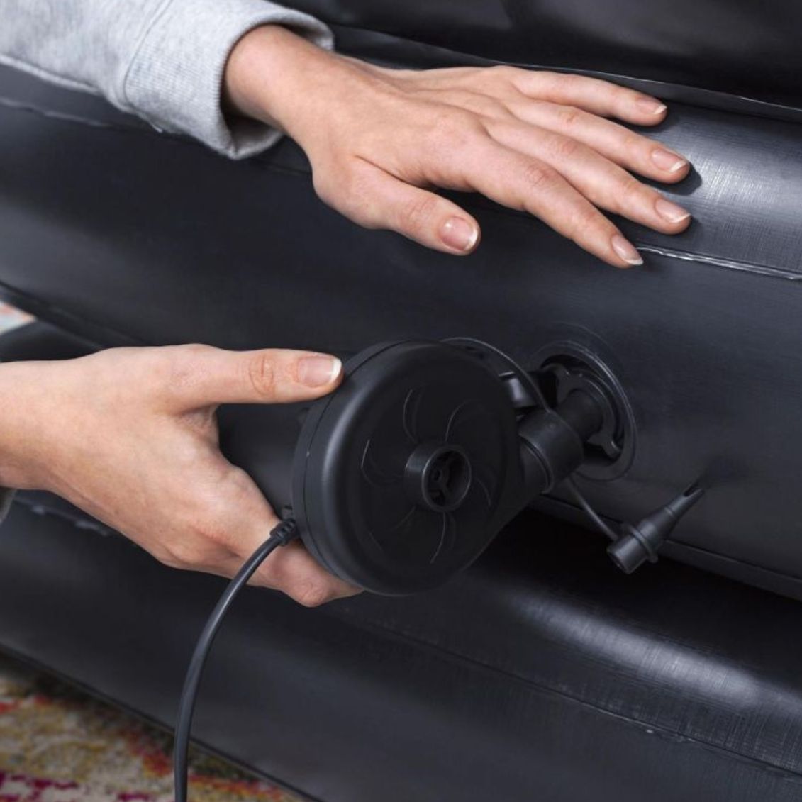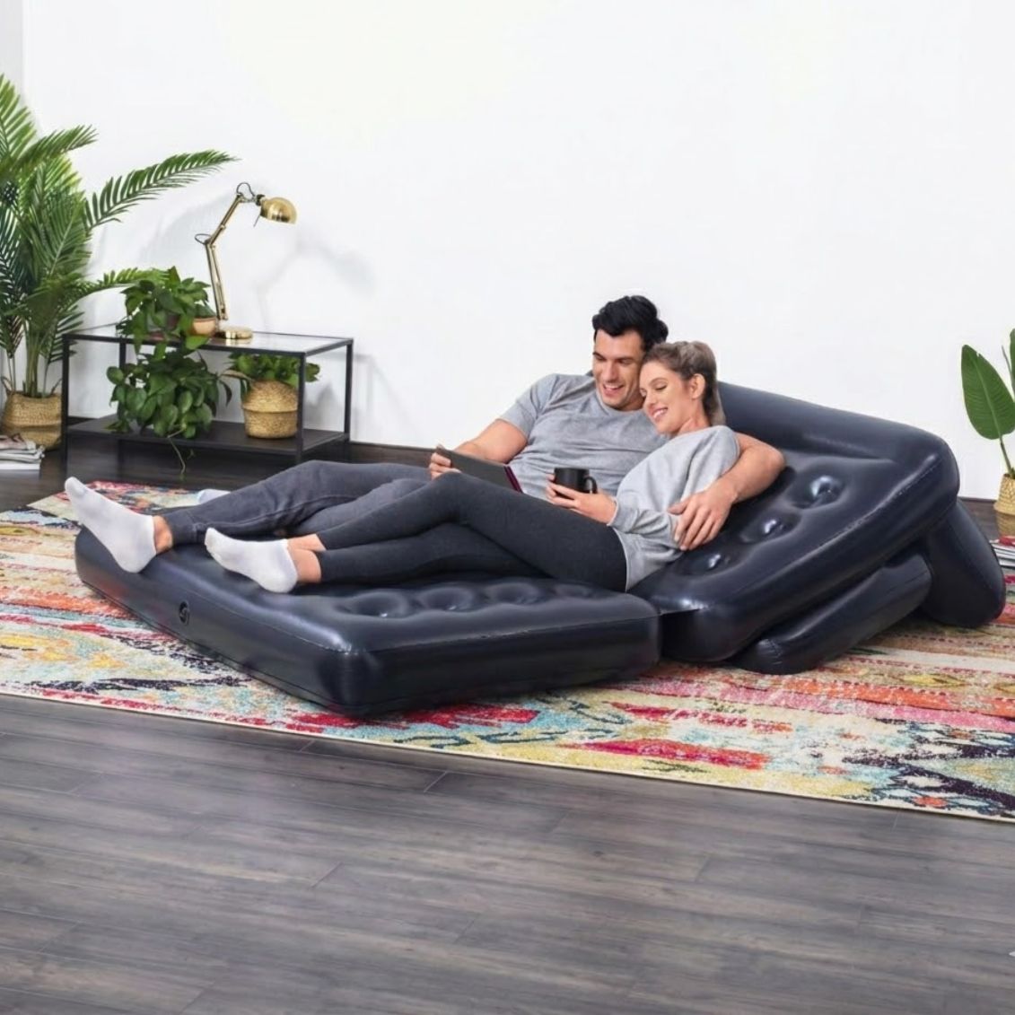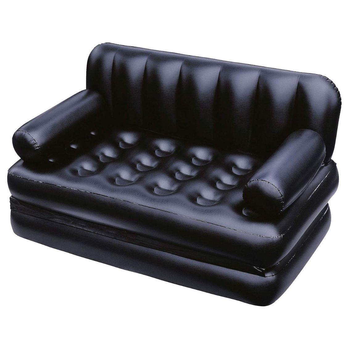 .Il Divano Letto Gonfiabile 5 in 1 Bestway (188x152x64 cm) di colore nero è la soluzione d'arredo definitiva per chi cerca versatilità, comfort e design salvaspazio in un unico prodotto. Grazie al suo intelligente sistema pieghevole, questo divano multifunzionale si trasforma in pochi secondi offrendo ben cinque configurazioni differenti: comodo divano a due posti, pratica chaise longue, morbida poltrona reclinabile, letto matrimoniale standard o letto singolo rialzato a doppio strato. Realizzato in robusto vinile pre-testato con struttura interna Coil-Beam, garantisce una straordinaria stabilità e un sostegno ottimale, supportando pesi fino a 300 kg. La superficie floccata dona una piacevole sensazione vellutata al tatto, perfetta per rilassarsi davanti alla TV o per ospitare amici. Dotato di valvole per il gonfiaggio rapido, include una comoda sacca per portarlo in vacanza o riporlo senza ingombri nell'armadio.