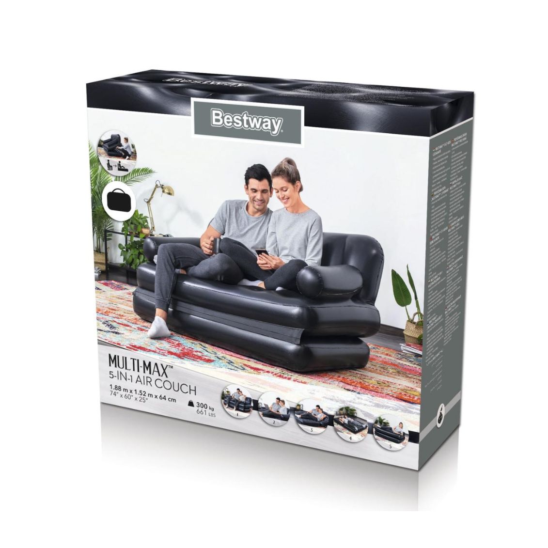 Bestway Multi-Max 5-in-1 (art. 75054) è un divano gonfiabile di colore nero trasformabile in 5 diverse posizioni di seduta e riposo, con dimensioni di 188 x 152 x 64 cm. Codice EAN: 6942138924060.