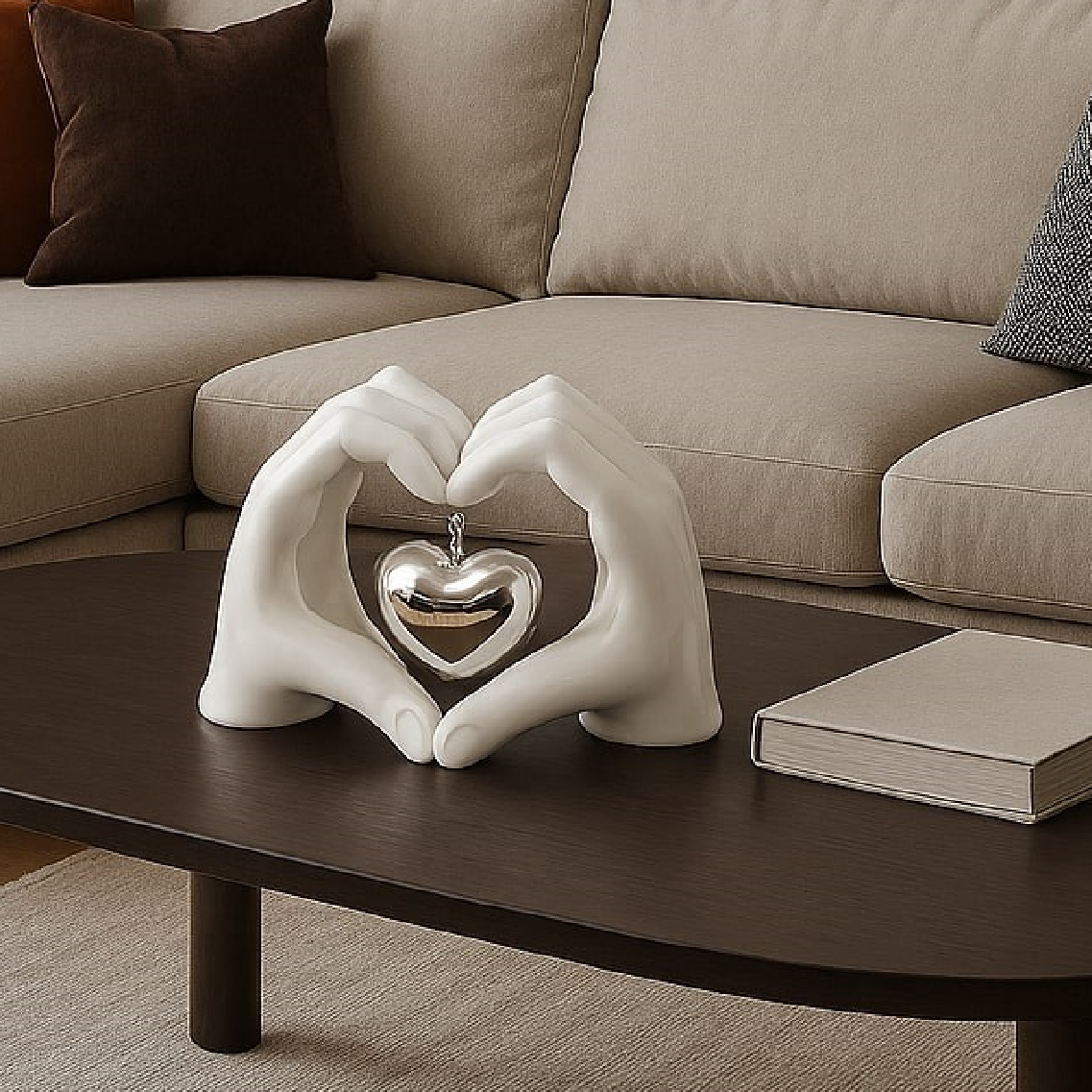 Il gesto delle due mani che formano un cuore è uno dei simboli più universali di amore e unione, qui reso in ceramica con una forma scultorea pulita e contemporanea. Il cuore argentato pendente al centro aggiunge profondità visiva e un dettaglio prezioso alla composizione. Le dimensioni generose la rendono una presenza scenica importante su un tavolino da salotto o una mensola. È una scelta molto apprezzata come regalo per matrimoni, anniversari, San Valentino o per abbellire la propria casa con un oggetto dal significato speciale.