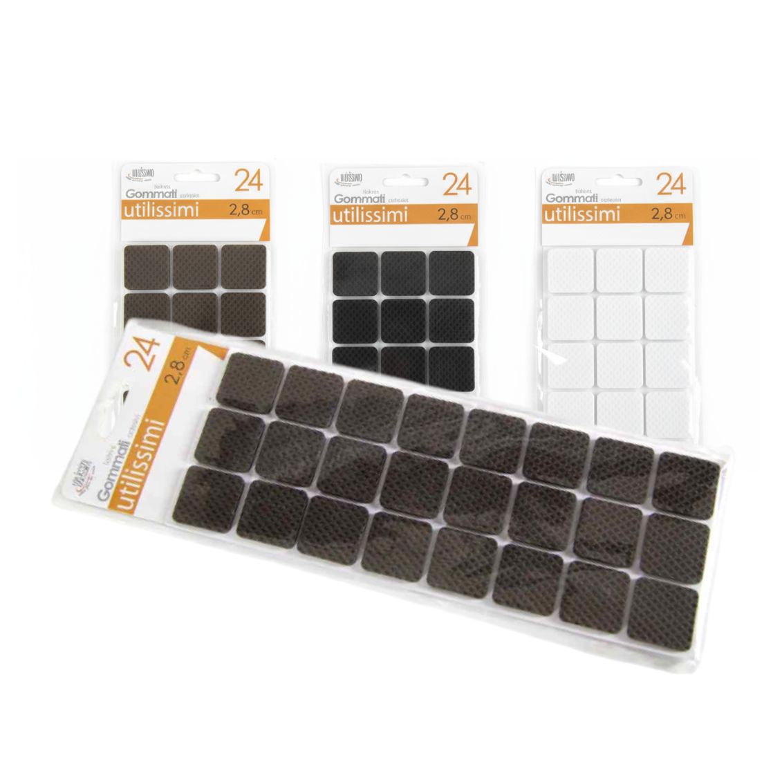 Set di 24 feltrini quadrati gommati da 2,8cm! Perfetti per proteggere pavimenti da graffi causati da mobili pesanti e di grandi dimensioni. Base gommata antiscivolo per massima aderenza e stabilità. Disponibili in colori assortiti, con retro autoadesivo per applicazione rapida e sicura.
