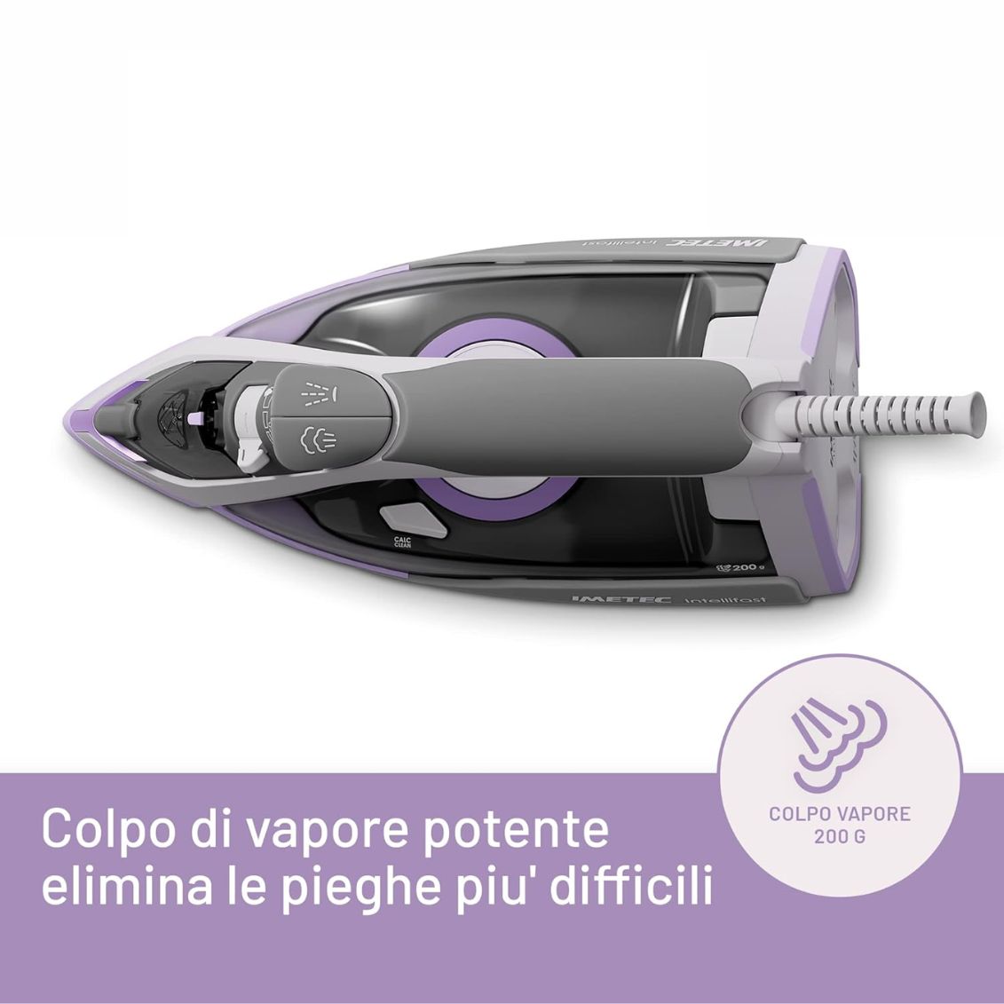 Imetec Intellifast rivoluziona il modo di stirare rendendolo più semplice e sicuro. Basta accenderlo e iniziare: puoi passare da una camicia di cotone a un abito sintetico senza attendere che la piastra si raffreddi o riscaldi. La funzione vapore verticale è perfetta per rinfrescare tende e giacche direttamente sulla gruccia. Il serbatoio da 300 ml offre una buona autonomia, mentre il cavo lungo 1,9 metri assicura libertà di movimento sull'asse da stiro. Il design ergonomico e i materiali di qualità rendono l'impugnatura comoda anche per sessioni prolungate.