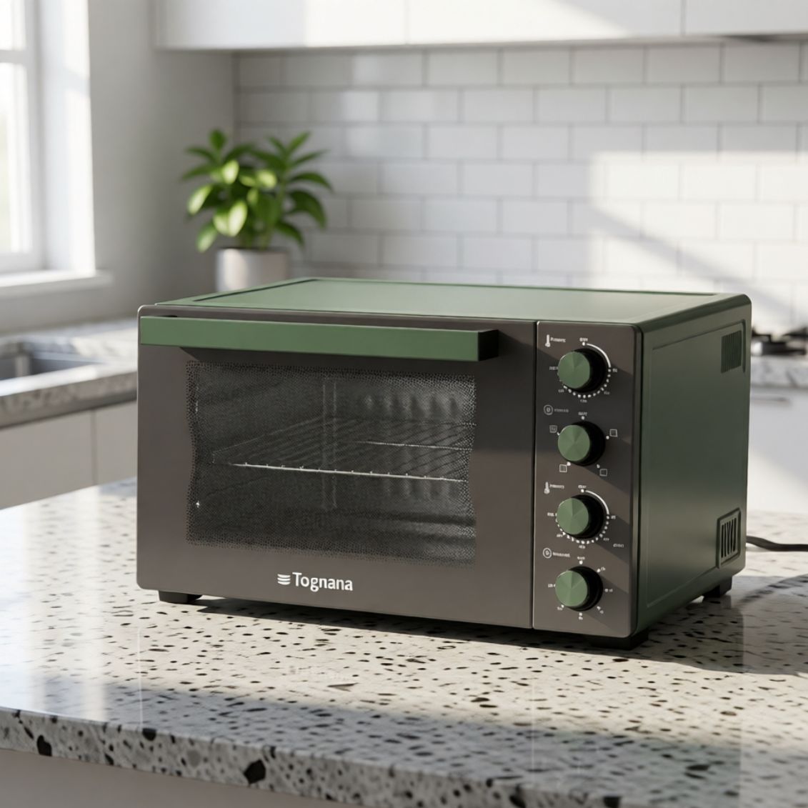 .Il forno elettrico ventilato Iridea Verde Salvia di Tognana da 35 litri unisce prestazioni professionali e design moderno. Con potenza 1600W, corpo in alluminio e pareti interne antiaderenti, offre 4 funzioni di cottura: base, grill, combinata e ventilata. Doppio termostato regolabile separatamente da 70°C a 230°C per controllo preciso resistenza superiore e inferiore. Include griglia in acciaio, leccarda antiaderente, vassoio raccoglibriciole e maniglia. Vetro doppio per isolamento termico, timer 60 minuti con segnale acustico e resistenze riscaldanti in acciaio corazzato. Il raffinato colore verde salvia dona eleganza contemporanea a ogni cucina.