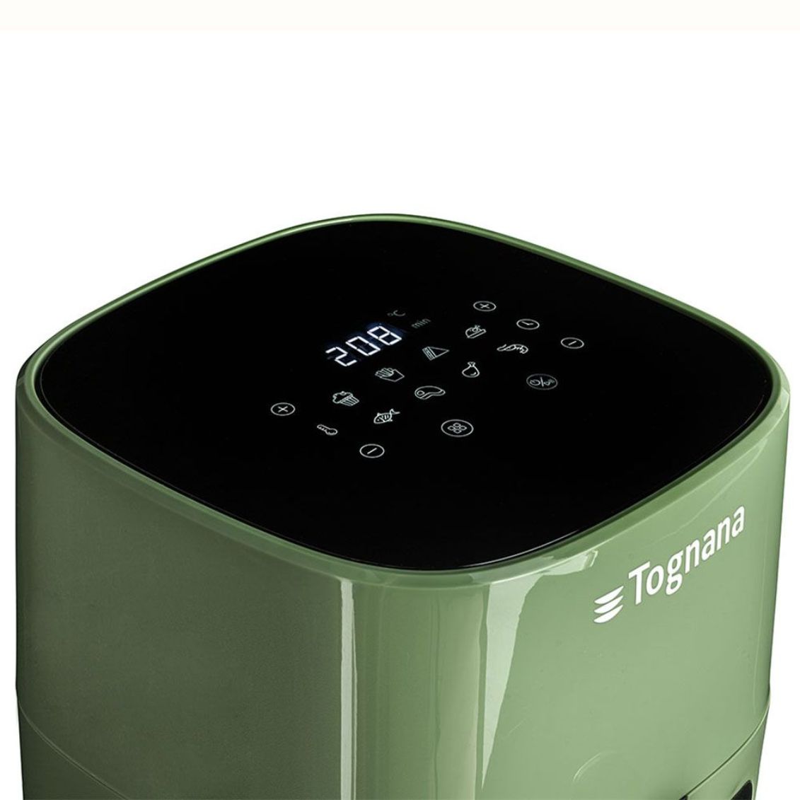 .La friggitrice ad aria Iridea Verde Salvia di Tognana rivoluziona il modo di cucinare sano e gustoso. Con capacità di 5,5 litri e potenza 1500W, cuoce senza olio patatine, pollo, verdure, dolci e molto altro. Display digitale, 8 programmi preimpostati, temperatura regolabile 80-200°C e timer 60 minuti garantiscono risultati perfetti. Include cestello con griglia antiaderente lavabile in lavastoviglie. Sicurezza garantita da protezione surriscaldamento, spegnimento automatico e sistema di interruzione alimentazione. Il raffinato design verde salvia della linea Iridea Tognana dona un tocco di eleganza contemporanea a ogni cucina moderna.