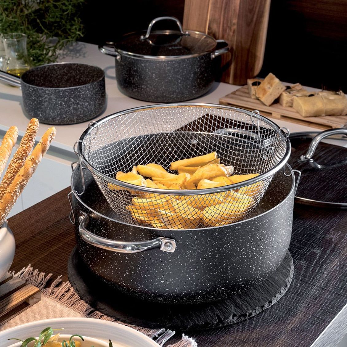 La friggitrice Big Family è progettata per offrire versatilità e sicurezza in cucina. Il diametro generoso di 28 cm permette di friggere in una sola volta patatine per tutta la famiglia, calamari, verdure pastellate o dolci come zeppole e bomboloni. I doppi manici in acciaio inox garantiscono una presa salda e bilanciata anche quando la pentola è piena e pesante. Grazie al rivestimento interno antiaderente e resistente alle alte temperature, può essere utilizzata anche per cotture diverse dalla frittura: dal brasato alle conserve sott'olio. L'idoneità all'uso in forno apre ulteriori possibilità, trasformandola in una teglia multifunzionale.