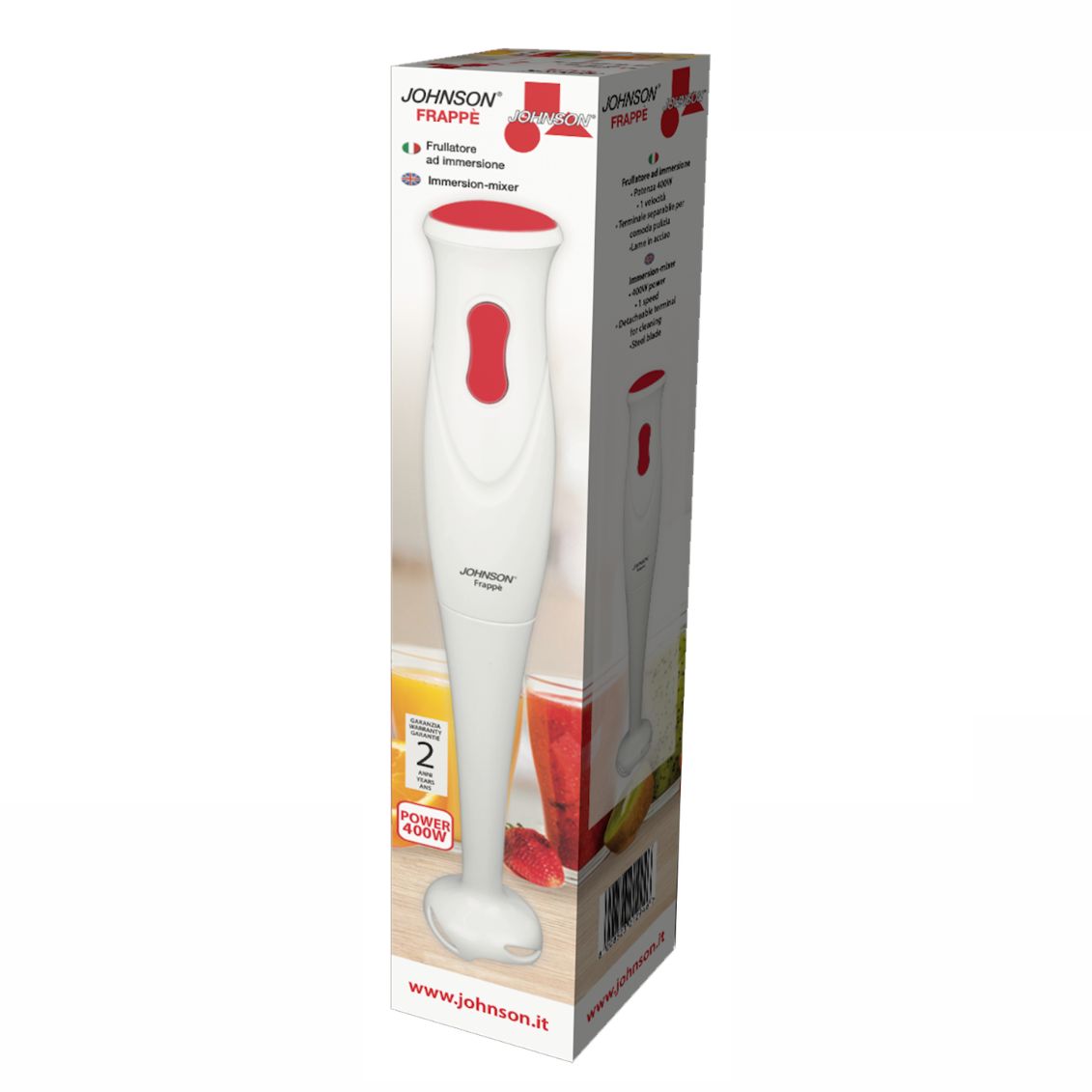 .FRAPPÈ è il frullatore ad immersione di JOHNSON semplice e maneggevole. Pratico e compatto, regala un piccolo aiuto in cucina per preparazioni veloci e quotidiane. Grazie alla sua potenza di 400W permette di preparare piatti in modo semplice e veloce senza complicazioni. Dotato di impugnatura ergonomica con un solo pulsante d'avvio per massima semplicità d'uso. FRAPPÈ frulla e mixa ottenendo composti omogenei in pochi istanti grazie alle sue lame in acciaio inox affilate e resistenti. Il terminale in plastica è separabile per una facile e rapida pulizia. Leggero (solo 0,5 kg) e compatto, è l'ideale per chi cerca un minipimer essenziale, affidabile ed economico. Perfetto per frullati, zuppe, salse e pappe.