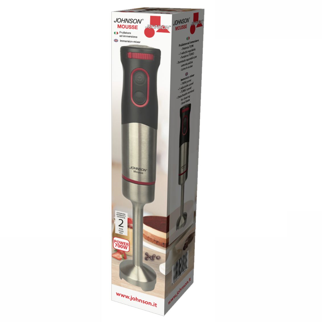 .Con il frullatore ad immersione MOUSSE di JOHNSON, godi di una potenza ottimale senza alcuna fatica grazie a un motore da 700W. Dotato di impugnatura ergonomica con due pulsanti facili da raggiungere: regolazione della velocità variabile e funzione TURBO per massima potenza istantanea, preparando così una varietà di piatti in pochissimo tempo. Il corpo è metà in acciaio inox e metà in materiale plastico resistente per un perfetto equilibrio tra robustezza ed ergonomia. Il terminale in acciaio inox è separabile per una facile e igienica pulizia. Le lame in acciaio inox affilate garantiscono frullati perfetti, zuppe vellutate e salse cremose. Pratico, semplice e veloce da pulire.