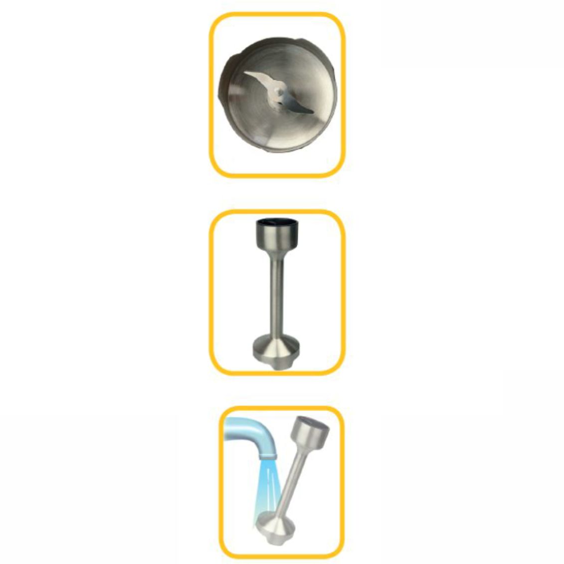 Pratico, semplice e veloce per una facile pulizia. Il terminale in acciaio inox si separa facilmente dal corpo motore e si lava con acqua e sapone neutro o direttamente sotto il rubinetto. Le lame in acciaio inox mantengono il filo a lungo e non arrugginiscono. Il corpo motore si pulisce con un panno umido senza mai immergerlo in acqua. Dopo ogni utilizzo, sciacquare subito il terminale per evitare che gli ingredienti si secchino. Asciugare completamente prima di riporre.