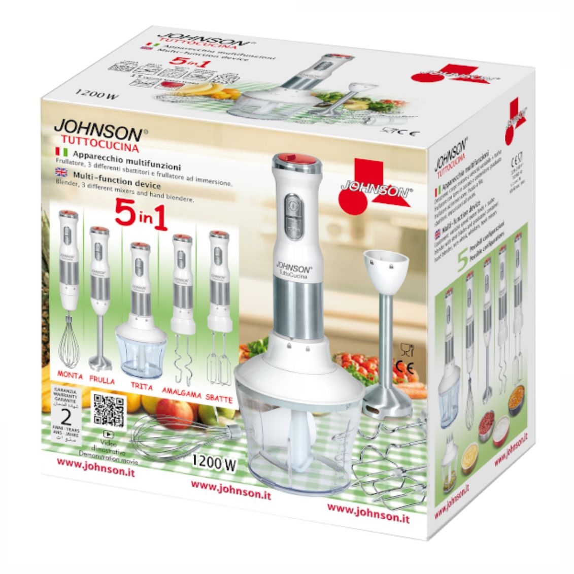 .TUTTOCUCINA di JOHNSON è un frullatore multifunzione 5 in 1 ideale per soddisfare tutte le tue diverse esigenze. Dotato di frullatore con lame in acciaio inox e contenitore in plastica graduato per uso alimentare, frullatore ad immersione professionale e 3 diversi tipi di sbattitori (frusta a filo, frusta per sbattere, gancio impastatore). Potenza 1200W con velocità variabile regolabile e pulsante turbo per risultati perfetti. Grazie ai suoi innumerevoli accessori è ideale per miscelare, frantumare e macinare. Potrai fare frullati, caffè, zuppe, cibo per neonati e molto altro. Con 15 diverse impostazioni di velocità ottieni i migliori risultati senza eccessivo rumore. Facile da smontare e pulire, lavabile in lavastoviglie (escluse parti motore).