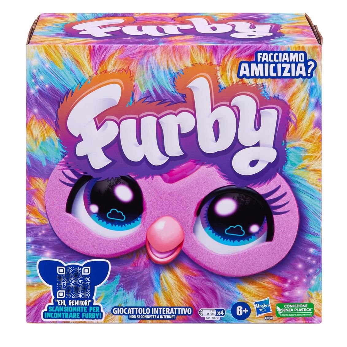 Inserisci 4 batterie AA (non incluse) e accendi Furby per iniziare un'amicizia speciale! Premi la gemma a forma di cuore e di' "Ehi Furby!" seguito da uno dei 5 comandi vocali per attivare le diverse modalità interattive: "Vai con la musica" per sbloccare canzoni diverse e adorabili passi di danza, "Spettacolo di luci" per luci che cambiano colore e reagiscono al tuo tocco, "Ricopione in azione" per farlo ripetere ciò che dici scoprendo 6 divertenti voci esilaranti, "Prevedi il futuro" per fare domande e ascoltare buffe previsioni, "Rilassiamoci insieme" per esercizi di respirazione e modi di dire ottimistici. Furby risponde a abbracci, pacche sulla testa, quando lo scuoti o gli dai da mangiare con il ciondolo pizza o con il dito. I suoi occhi LCD si aprono e chiudono esprimendo emozioni, le orecchie si illuminano con effetti luminosi di diverso tipo e cambia colore, balla con mosse graziose! Pettina i suoi capelli arcobaleno tie dye e decoralo con gli accessori moda inclusi. Più giochi con Furby, più modalità sblocchi! Se hai 2 Furby, mettili vicini per farli interagire e parlare tra loro. Furby parla sia italiano che furbish, la lingua speciale dei Furby. Non si connette a Internet per un'esperienza di gioco senza schermi, sicura e tangibile.