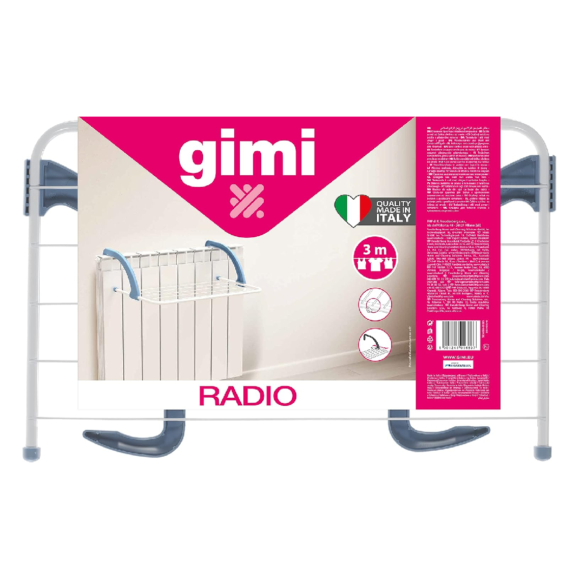 Gimi Radio è uno stendibiancheria da termosifone in acciaio con bracci in resina regolabili, con 3 m di spazio stendibile e dimensioni 52 x 34,5 x 18 cm. Codice EAN: 8001244016897.