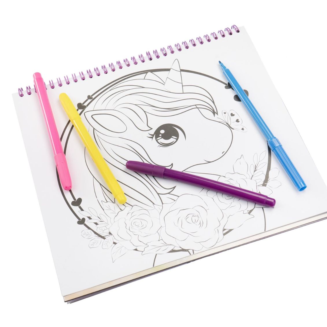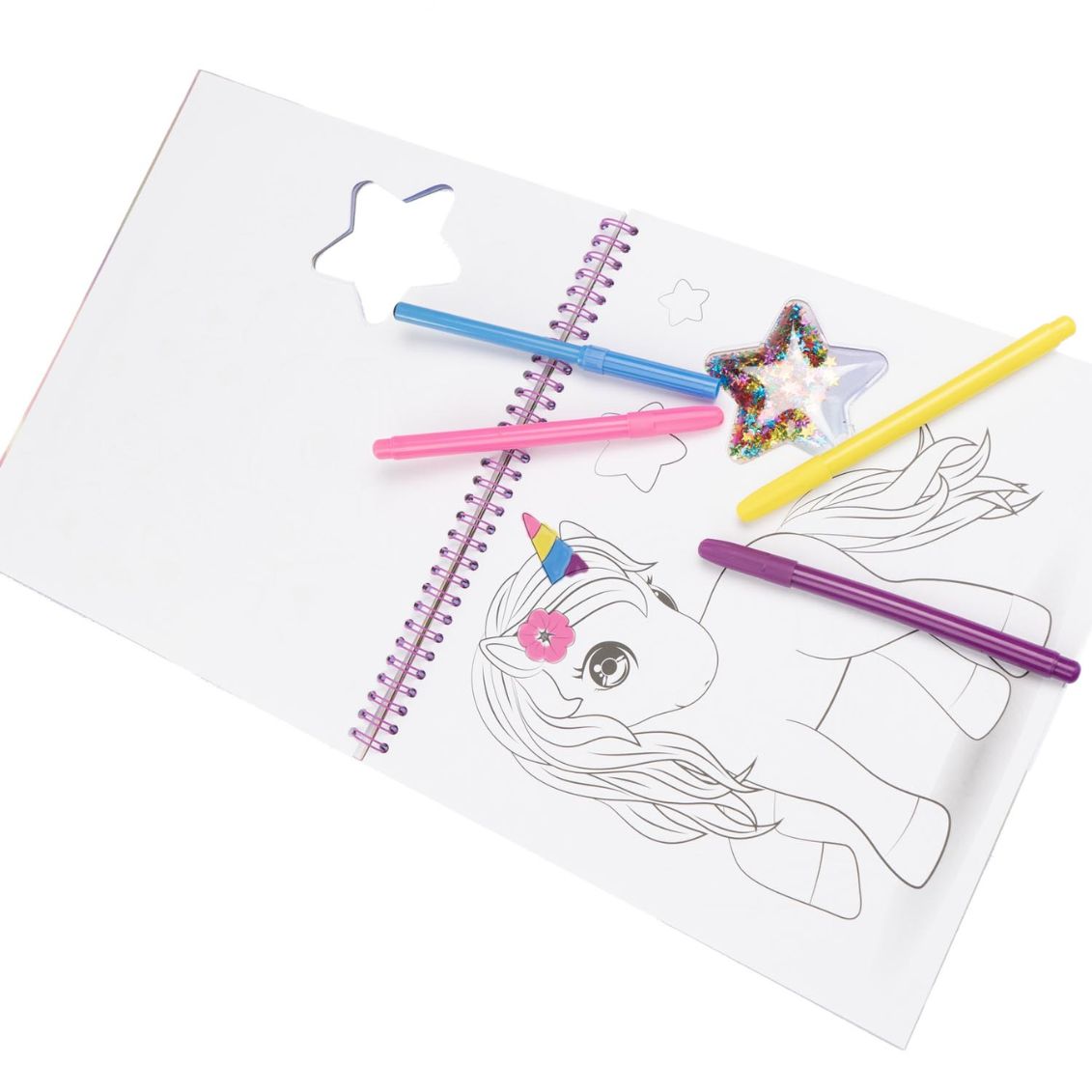 .Libro da disegno con immagini da colorare. Il blocco è decorato con una stella di glitter scintillante che ritroverai al centro di ogni pagina. All’interno tantissime bozze con simpatici unicorni. Oltre a colorare potrai aggiungere soffici adesivi alle tavole.