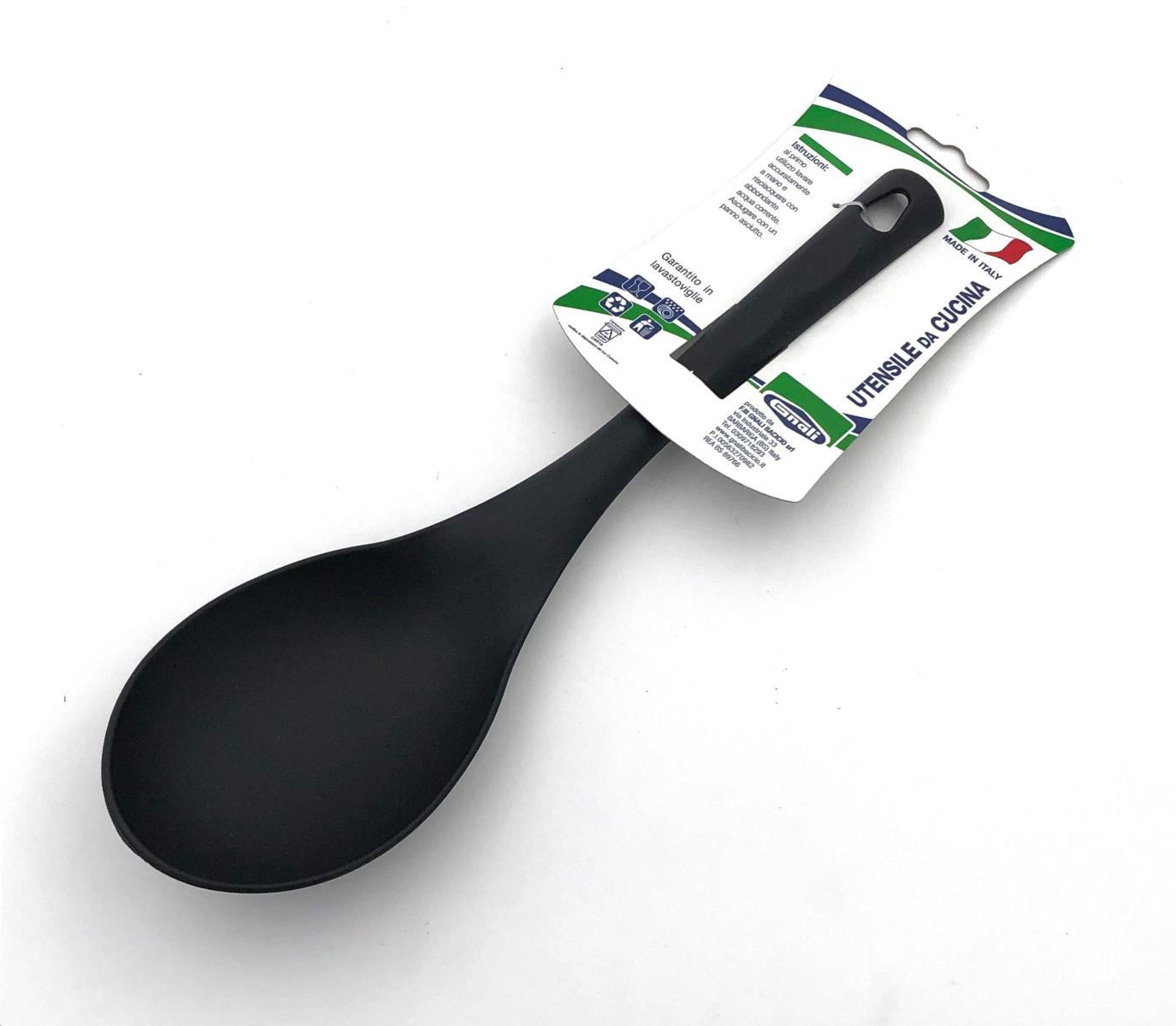 Cucchiaio multiuso misura 28 cm adatto per raccogliere e servire riso, pietanze liquide o mescolare zuppe, sughi, brodi, creme, stufati e pasta. Il cucchiaio ha una struttura in nylon che favorisce l'isolamento termico e fa si che la spatola sia resistente alle alte temperature. L'utensile è immune all'attacco degli acidi e non assorbe odori degli alimenti grazie al suo particolare rivestimento che non graffia e non danneggia le padelle. Il manico ampio ed ergonomico garantisce una presa salda e rende l'utilizzo agevole anche durante lunghe sessioni di cottura. Utilizzabile anche con pentole con rivestimento anti-aderente poiché non ne danneggia la superficie. Dotata di occhiello per essere appesa. Lavabile in lavastoviglie