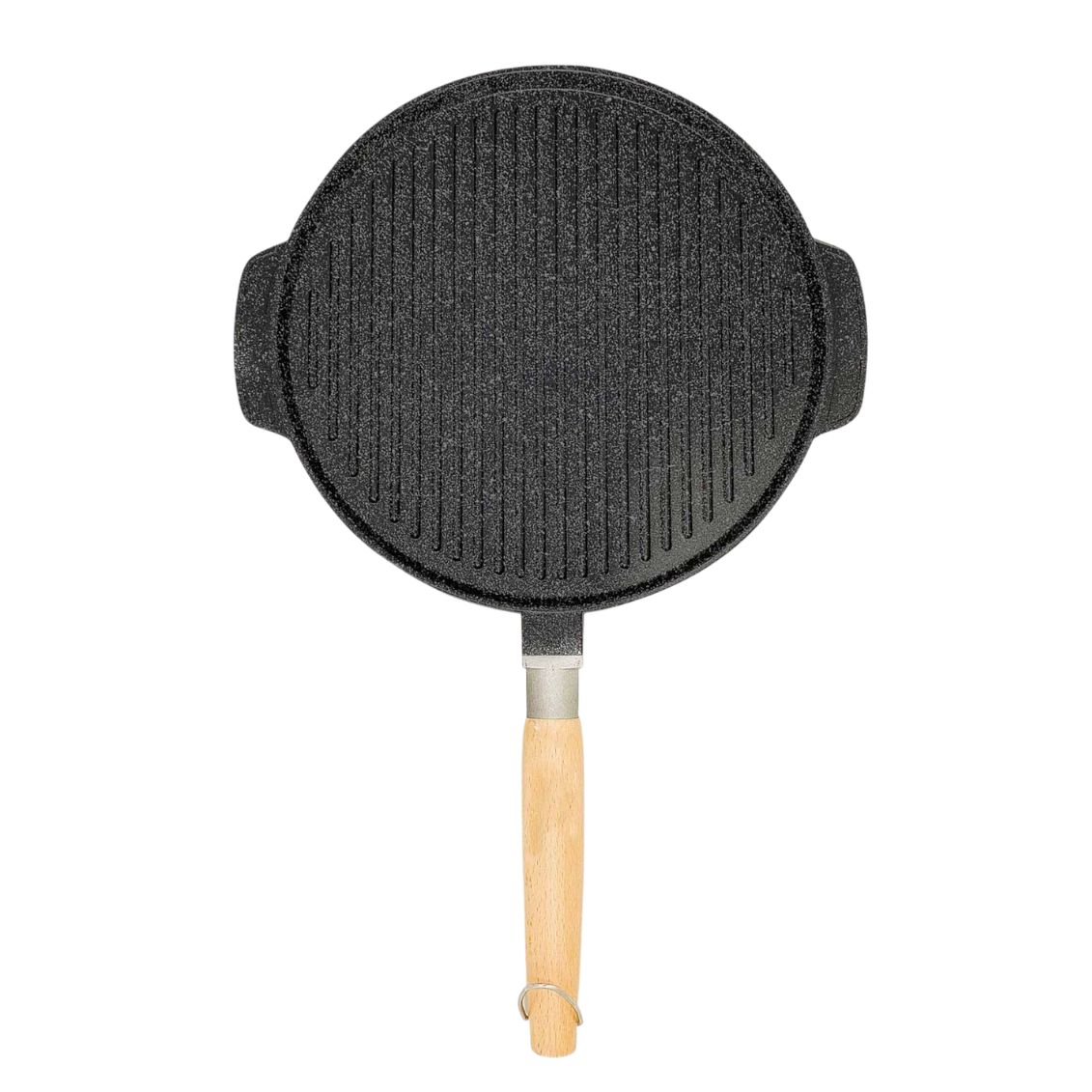 Il manico in legno rimovibile permette di utilizzare la piastra sia su fornelli a gas che direttamente nel forno, grazie alla sua resistenza alle altissime temperature. Non contiene PFOA e può essere lavata in lavastoviglie.