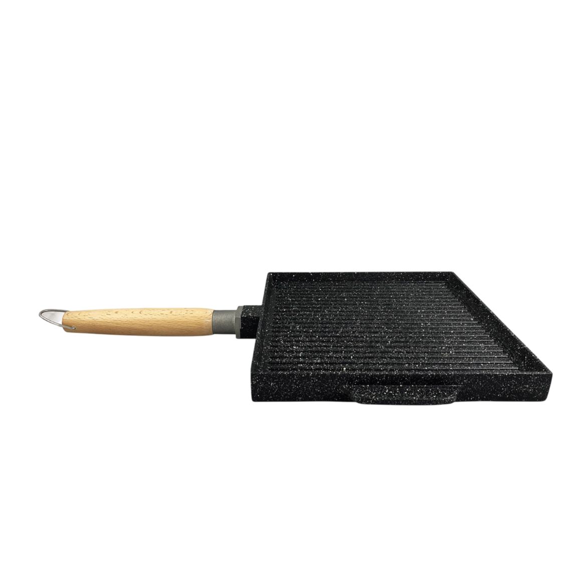 Il Grill Double Vulcania 36x26cm rappresenta l'innovazione nella cottura domestica, combinando bistecchiera e crepiera in un unico strumento double face. Realizzato in alluminio pressofuso con spessore di 3,5mm, garantisce distribuzione uniforme del calore e resistenza alle altissime temperature. Il manico rimovibile in legno permette di utilizzarlo sia sui fornelli che nel forno, offrendo versatilità unica.