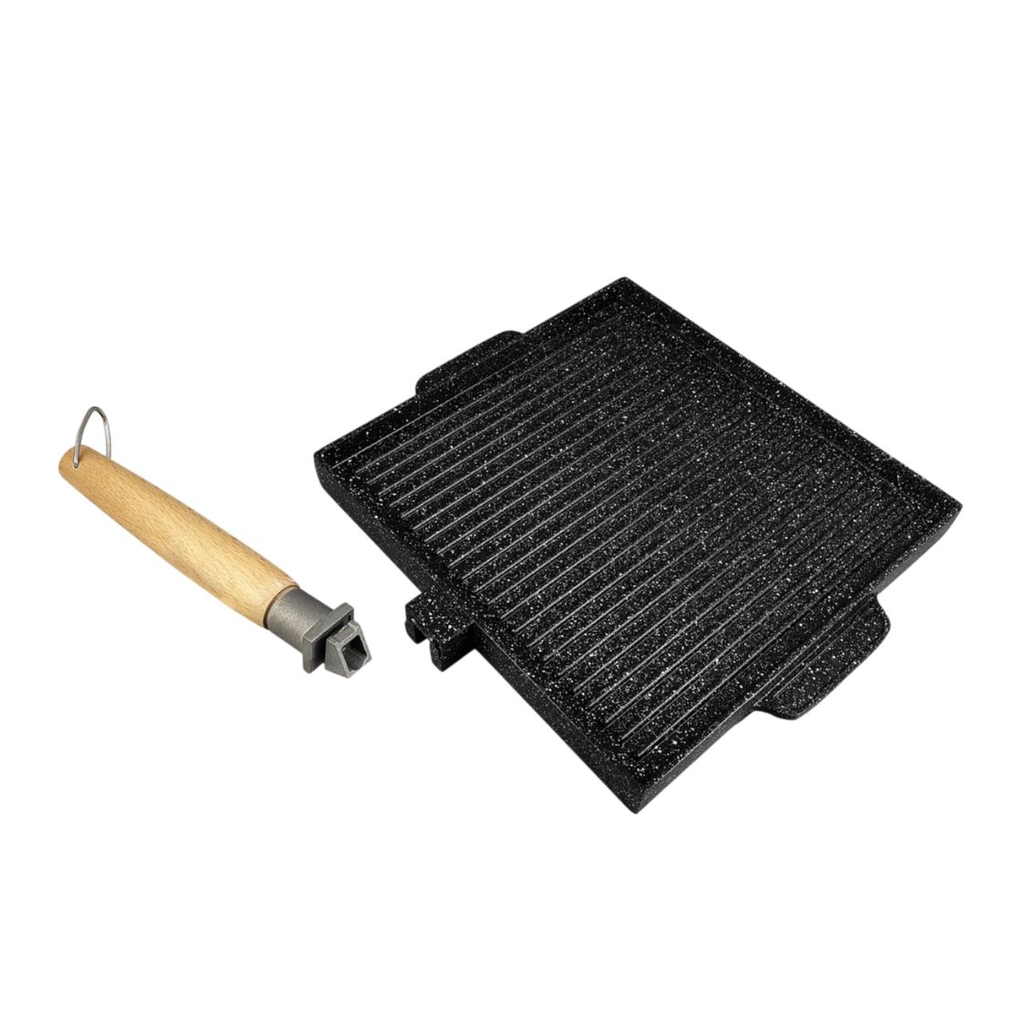 Il manico in legno è progettato per essere facilmente rimovibile tramite un sistema di aggancio sicuro. Basta ruotare leggermente il manico e sfilarlo dalla sua sede. Una volta rimosso, la piastra può essere inserita direttamente nel forno. Assicurarsi che il manico sia completamente rimosso prima di inserire nel forno per evitare danni al legno.