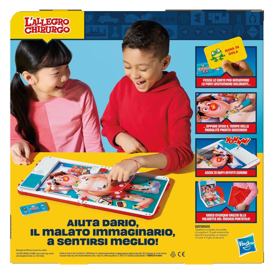 Modalità Ospedale: Pesca una carta Dottore che indica quale parte del corpo rimuovere. Usa le pinzette per estrarre delicatamente la parte senza toccare i bordi metallici. Se tocchi il bordo, il naso di Dario si illumina e scatta l'allarme BZZZT! Il giocatore con più parti rimosse con successo vince.