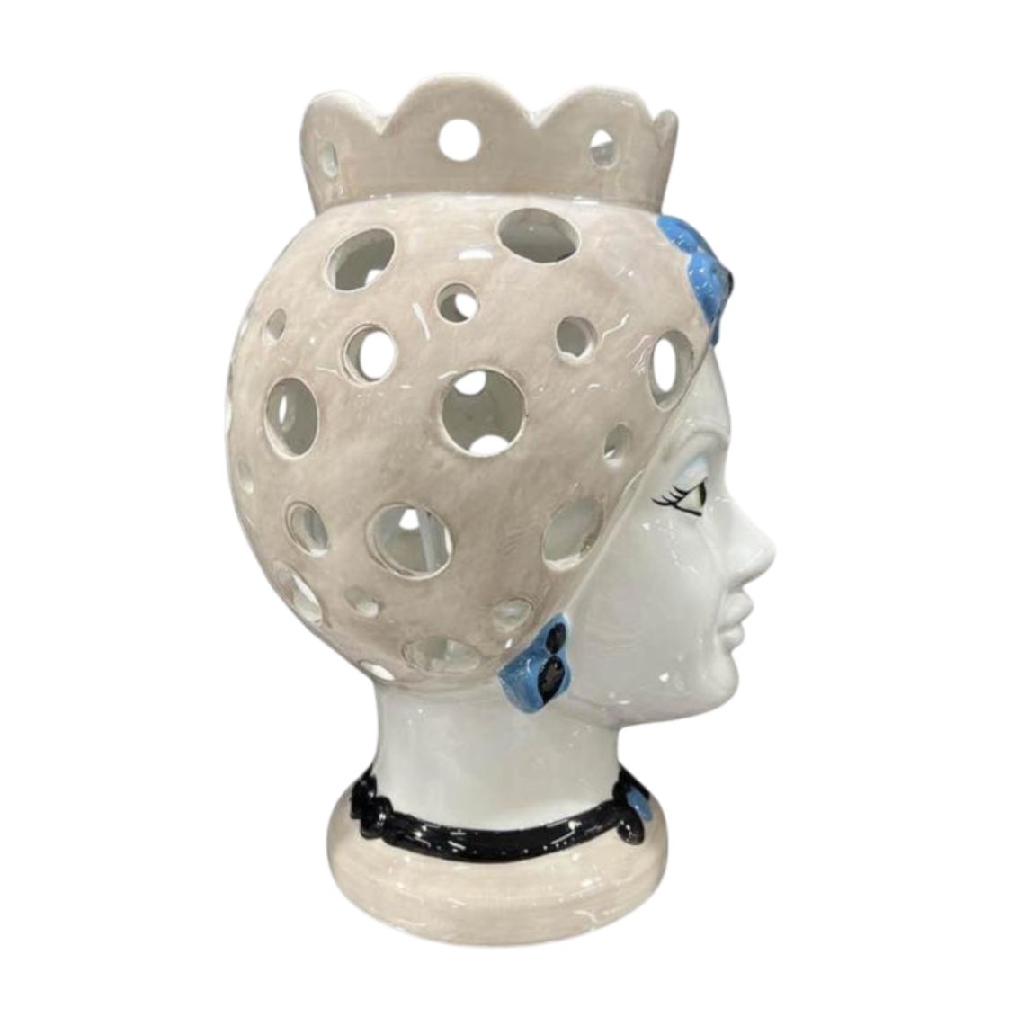 Questa Lampada Testa Moro Donna con decorazioni blu rappresenta l'evoluzione contemporanea del design tradizionale siciliano, combinando l'eleganza del blu cobalto con la funzionalità moderna. Realizzata in ceramica di qualità, questa lampada decorativa misura 24x24x36 centimetri ed è caratterizzata da una corona traforata che crea affascinanti giochi di luce.