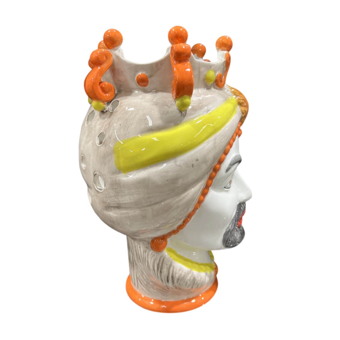La corona arancione tridimensionale con elementi scultorei in rilievo crea un effetto maestoso, mentre il turbante giallo luminoso avvolge elegantemente la testa. La barba grigia accuratamente modellata conferisce dignità e saggezza al volto maschile, mentre i dettagli decorativi arancioni sulla collana e la base completano un design di straordinaria ricchezza visiva.