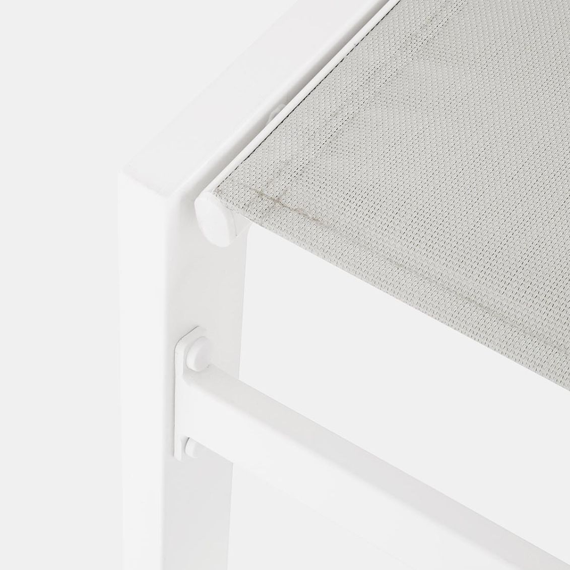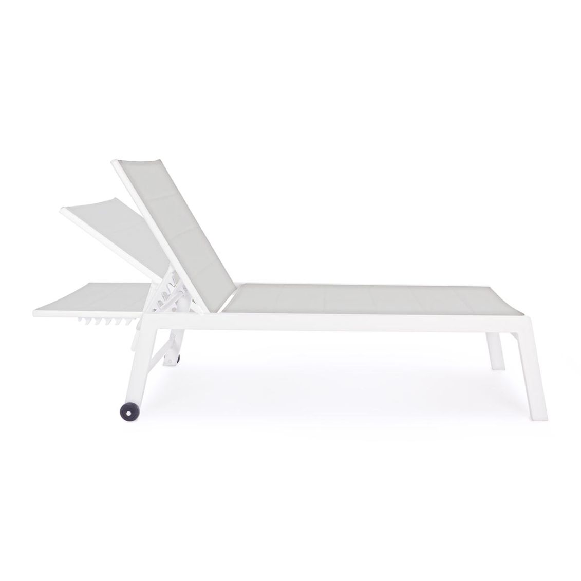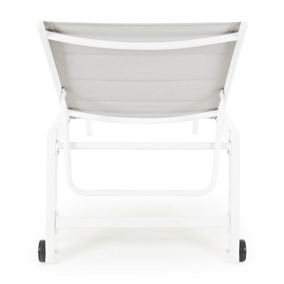 Bizzotto Hilde è un lettino prendisole da esterno in alluminio verniciato a polvere color bianco nuvola, con seduta e schienale in textilene 2x1 imbottito e schienale regolabile in 5 posizioni. Dotato di ruote per il trasporto facilitato. Dimensioni: 65 x 200 x 102 cm, altezza seduta 43 cm, peso 7,3 kg. Codice EAN: 8051836351974.