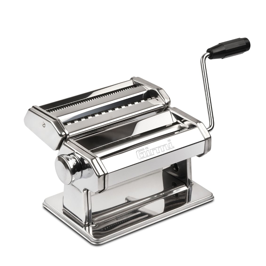 .Macchina per la pasta manuale con struttura in acciaio inox e 9 regolazioni di spessore da 0,3 a 3,5 mm, dotata di rulli da 15 cm in alluminio conformi al contatto alimentare. Prepara 3 formati di pasta fresca: lasagne, tagliatelle e spaghetti. Funzionamento manuale con manovella ergonomica, include morsetto di fissaggio per stabilità su qualsiasi piano. Dimensioni compatte 180x143x250 mm, peso 1,9 kg.
